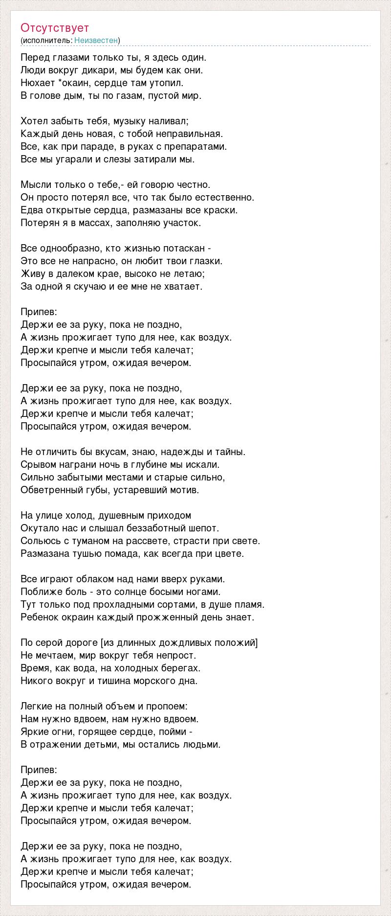 Перед глазами только ты, я здесь один. Люди вокруг дикари, мы будем как они. Нюхает *окаин, сердце там утопил. В голове дым, ты по газам, пустой мир. Хотел забыть тебя, музыку наливал; Каждый день новая, с тобой неправильная. Все, как при параде, в руках с препаратами. Все мы угарали и слезы затирали мы. Мысли только о тебе,- ей говорю честно. Он просто потерял все, что так было естественно. Едва открытые сердца, размазаны все краски. Потерян я в массах, заполняю участок. Все однообразно, кто жизнью потаскан - Это все не напрасно, он любит твои глазки. Живу в далеком крае, высоко не летаю; За одной я скучаю и ее мне не хватает. Припев: Держи ее за руку, пока не поздно, А жизнь прожигает тупо для нее, как воздух. Держи крепче и мысли тебя калечат; Просыпайся утром, ожидая вечером. Держи ее за руку, пока не поздно, А жизнь прожигает тупо для нее, как воздух. Держи крепче и мысли тебя калечат; Просыпайся утром, ожидая вечером. Не отличить бы вкусам, знаю, надежды и тайны. Срывом награни ночь в глубине мы искали. Сильно забытыми местами и старые сильно, Обветренный губы, устаревший мотив. На улице холод, душевным приходом Окутало нас и слышал беззаботный шепот. Сольюсь с туманом на рассвете, страсти при свете. Размазана тушью помада, как всегда при цвете. Все играют облаком над нами вверх руками. Поближе боль - это солнце босыми ногами. Тут только под прохладными сортами, в душе пламя. Ребенок окраин каждый прожженный день знает. По серой дороге [из длинных дождливых положий] Не мечтаем, мир вокруг тебя непрост. Время, как вода, на холодных берегах. Никого вокруг и тишина морского дна. Легкие на полный объем и пропоем: Нам нужно вдвоем, нам нужно вдвоем. Яркие огни, горящее сердце, пойми - В отражении детьми, мы остались людьми. Припев: Держи ее за руку, пока не поздно, А жизнь прожигает тупо для нее, как воздух. Держи крепче и мысли тебя калечат; Просыпайся утром, ожидая вечером. Держи ее за руку, пока не поздно, А жизнь прожигает тупо для нее, как воздух. Держи крепче и мысли тебя калечат; Просыпайся утром, ожидая вечером.