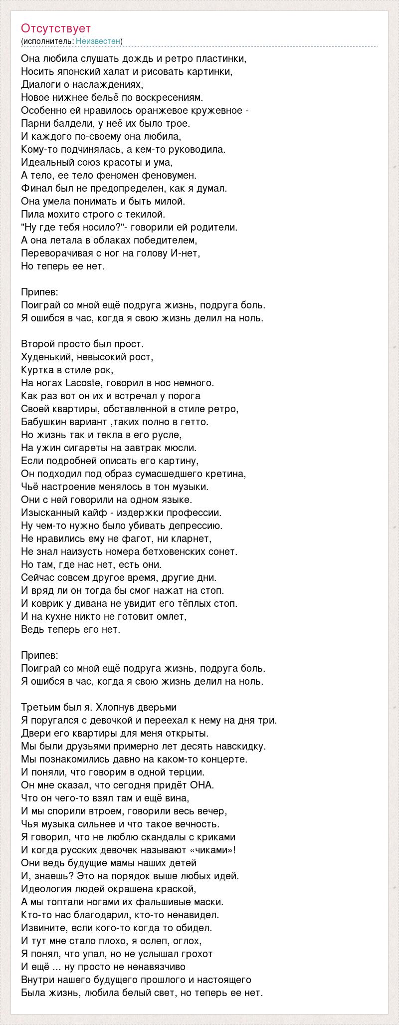Она любила слушать дождь и ретро пластинки, Носить японский халат и рисовать картинки, Диалоги о наслаждениях, Новое нижнее бельё по воскресениям. Особенно ей нравилось оранжевое кружевное - Парни балдели, у неё их было трое. И каждого по-своему она любила, Кому-то подчинялась, а кем-то руководила. Идеальный союз красоты и ума, А тело, ее тело феномен феновумен. Финал был не предопределен, как я думал. Она умела понимать и быть милой. Пила мохито строго с текилой. "Ну где тебя носило?"- говорили ей родители. А она летала в облаках победителем, Переворачивая с ног на голову И-нет, Но теперь ее нет. Припев: Поиграй со мной ещё подруга жизнь, подруга боль. Я ошибся в час, когда я свою жизнь делил на ноль. Второй просто был прост. Худенький, невысокий рост, Куртка в стиле рок, На ногах Lacoste, говорил в нос немного. Как раз вот он их и встречал у порога Своей квартиры, обставленной в стиле ретро, Бабушкин вариант ,таких полно в гетто. Но жизнь так и текла в его русле, На ужин сигареты на завтрак мюсли. Если подробней описать его картину, Он подходил под образ сумасшедшего кретина, Чьё настроение менялось в тон музыки. Они с ней говорили на одном языке. Изысканный кайф - издержки профессии. Ну чем-то нужно было убивать депрессию. Не нравились ему не фагот, ни кларнет, Не знал наизусть номера бетховенских сонет. Но там, где нас нет, есть они. Сейчас совсем другое время, другие дни. И вряд ли он тогда бы смог нажат на стоп. И коврик у дивана не увидит его тёплых стоп. И на кухне никто не готовит омлет, Ведь теперь его нет. Припев: Поиграй со мной ещё подруга жизнь, подруга боль. Я ошибся в час, когда я свою жизнь делил на ноль. Третьим был я. Хлопнув дверьми Я поругался с девочкой и переехал к нему на дня три. Двери его квартиры для меня открыты. Мы были друзьями примерно лет десять навскидку. Мы познакомились давно на каком-то концерте. И поняли, что говорим в одной терции. Он мне сказал, что сегодня придёт ОНА. Что он чего-то взял там и ещё вина, И мы спорили втроем, говорили весь вечер, Чья музыка сильнее и что такое вечность. Я говорил, что не люблю скандалы с криками И когда русских девочек называют «чиками»! Они ведь будущие мамы наших детей И, знаешь? Это на порядок выше любых идей. Идеология людей окрашена краской, А мы топтали ногами их фальшивые маски. Кто-то нас благодарил, кто-то ненавидел. Извините, если кого-то когда то обидел. И тут мне стало плохо, я ослеп, оглох, Я понял, что упал, но не услышал грохот И ещё ... ну просто не ненавязчиво Внутри нашего будущего прошлого и настоящего Была жизнь, любила белый свет, но теперь ее нет.