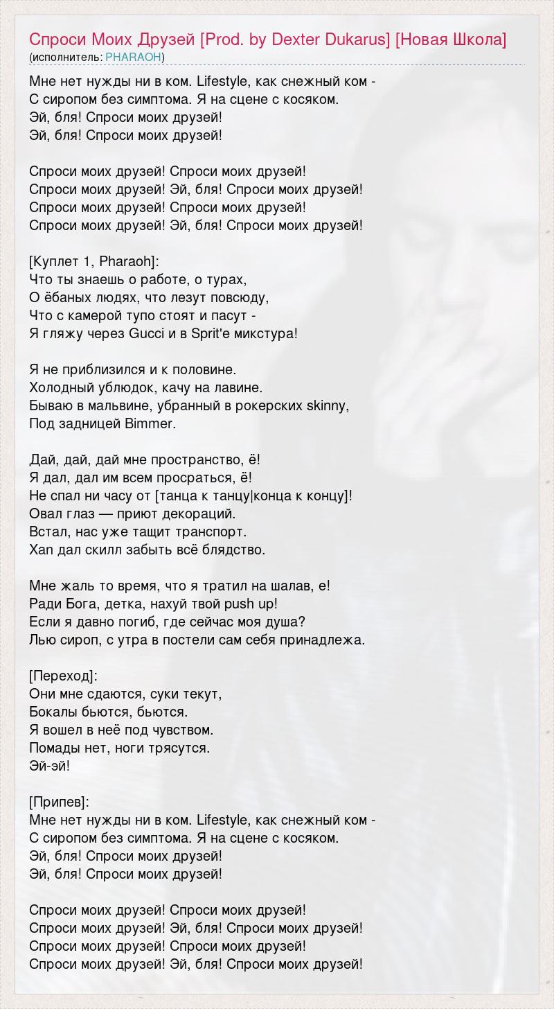 Мне нет нужды ни в ком. Lifestyle, как снежный ком - С сиропом без симптома. Я на сцене с косяком. Эй, бля! Спроси моих друзей! Эй, бля! Спроси моих друзей! Спроси моих друзей! Спроси моих друзей! Спроси моих друзей! Эй, бля! Спроси моих друзей! Спроси моих друзей! Спроси моих друзей! Спроси моих друзей! Эй, бля! Спроси моих друзей! [Куплет 1, Pharaoh]: Что ты знаешь о работе, о турах, О ёбаных людях, что лезут повсюду, Что с камерой тупо стоят и пасут - Я гляжу через Gucci и в Sprit'е микстура! Я не приблизился и к половине. Холодный ублюдок, качу на лавине. Бываю в мальвине, убранный в рокерских skinny, Под задницей Bimmer. Дай, дай, дай мне пространство, ё! Я дал, дал им всем просраться, ё! Не спал ни часу от [танца к танцу|конца к концу]! Овал глаз — приют декораций. Встал, нас уже тащит транспорт. Xan дал скилл забыть всё блядство. Мне жаль то время, что я тратил на шалав, е! Ради Бога, детка, нахуй твой push up! Если я давно погиб, где сейчас моя душа? Лью сироп, с утра в постели сам себя принадлежа. [Переход]: Они мне сдаются, суки текут, Бокалы бьются, бьются. Я вошел в неё под чувством. Помады нет, ноги трясутся. Эй-эй! [Припев]: Мне нет нужды ни в ком. Lifestyle, как снежный ком - С сиропом без симптома. Я на сцене с косяком. Эй, бля! Спроси моих друзей! Эй, бля! Спроси моих друзей! Спроси моих друзей! Спроси моих друзей! Спроси моих друзей! Эй, бля! Спроси моих друзей! Спроси моих друзей! Спроси моих друзей! Спроси моих друзей! Эй, бля! Спроси моих друзей!
