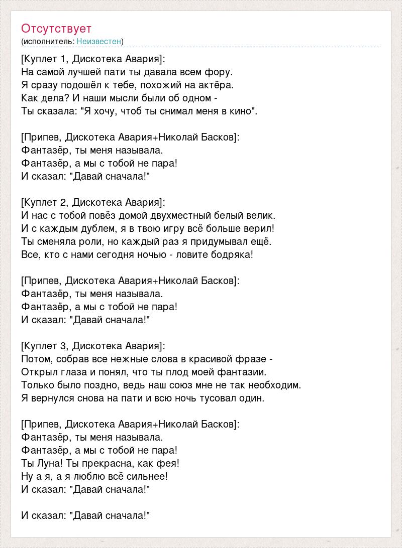 [Куплет 1, Дискотека Авария]: На самой лучшей пати ты давала всем фору. Я сразу подошёл к тебе, похожий на актёра. Как дела? И наши мысли были об одном - Ты сказала: "Я хочу, чтоб ты снимал меня в кино". [Припев, Дискотека Авария+Николай Басков]: Фантазёр, ты меня называла. Фантазёр, а мы с тобой не пара! И сказал: "Давай сначала!" [Куплет 2, Дискотека Авария]: И нас с тобой повёз домой двухместный белый велик. И с каждым дублем, я в твою игру всё больше верил! Ты сменяла роли, но каждый раз я придумывал ещё. Все, кто с нами сегодня ночью - ловите бодряка! [Припев, Дискотека Авария+Николай Басков]: Фантазёр, ты меня называла. Фантазёр, а мы с тобой не пара! И сказал: "Давай сначала!" [Куплет 3, Дискотека Авария]: Потом, собрав все нежные слова в красивой фразе - Открыл глаза и понял, что ты плод моей фантазии. Только было поздно, ведь наш союз мне не так необходим. Я вернулся снова на пати и всю ночь тусовал один. [Припев, Дискотека Авария+Николай Басков]: Фантазёр, ты меня называла. Фантазёр, а мы с тобой не пара! Ты Луна! Ты прекрасна, как фея! Ну а я, а я люблю всё сильнее! И сказал: "Давай сначала!" И сказал: "Давай сначала!"