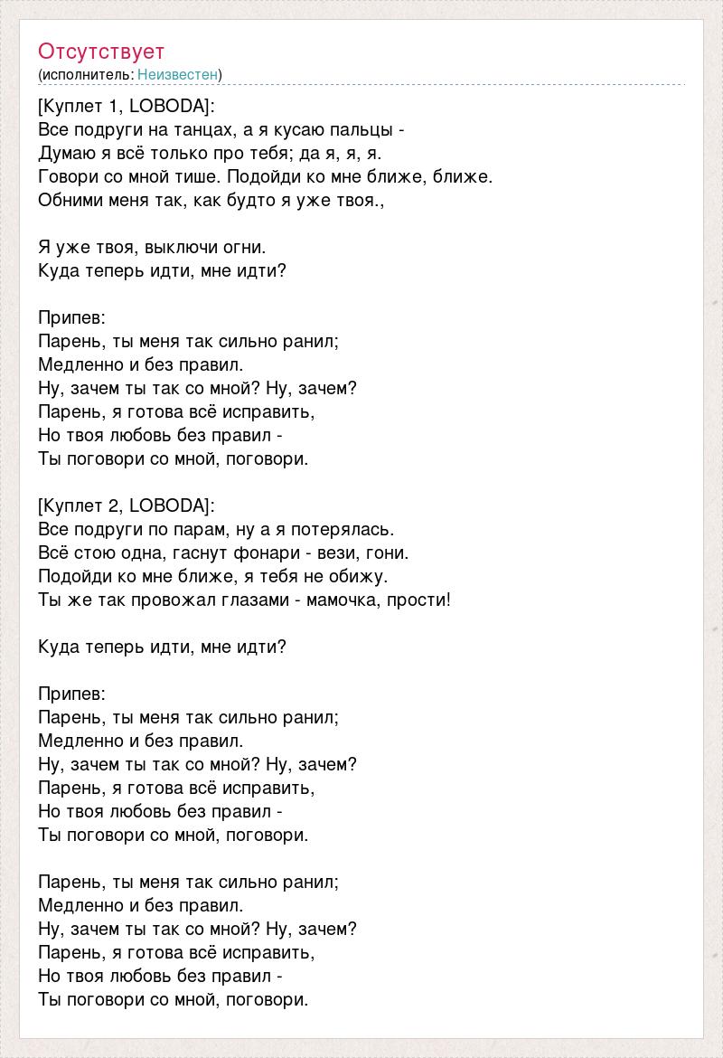[Куплет 1, LOBODA]: Все подруги на танцах, а я кусаю пальцы - Думаю я всё только про тебя; да я, я, я. Говори со мной тише. Подойди ко мне ближе, ближе. Обними меня так, как будто я уже твоя., Я уже твоя, выключи огни. Куда теперь идти, мне идти? Припев: Парень, ты меня так сильно ранил; Медленно и без правил. Ну, зачем ты так со мной? Ну, зачем? Парень, я готова всё исправить, Но твоя любовь без правил - Ты поговори со мной, поговори. [Куплет 2, LOBODA]: Все подруги по парам, ну а я потерялась. Всё стою одна, гаснут фонари - вези, гони. Подойди ко мне ближе, я тебя не обижу. Ты же так провожал глазами - мамочка, прости! Куда теперь идти, мне идти? Припев: Парень, ты меня так сильно ранил; Медленно и без правил. Ну, зачем ты так со мной? Ну, зачем? Парень, я готова всё исправить, Но твоя любовь без правил - Ты поговори со мной, поговори. Парень, ты меня так сильно ранил; Медленно и без правил. Ну, зачем ты так со мной? Ну, зачем? Парень, я готова всё исправить, Но твоя любовь без правил - Ты поговори со мной, поговори.