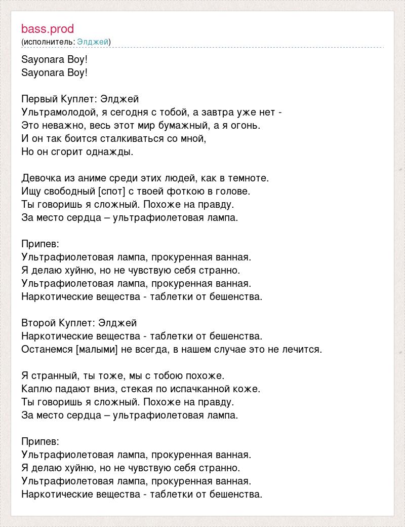 Sayonara Boy! Sayonara Boy! Первый Куплет: Элджей Ультрамолодой, я сегодня с тобой, а завтра уже нет - Это неважно, весь этот мир бумажный, а я огонь. И он так боится сталкиваться со мной, Но он сгорит однажды. Девочка из аниме среди этих людей, как в темноте. Ищу свободный [спот] с твоей фоткою в голове. Ты говоришь я сложный. Похоже на правду. За место сердца – ультрафиолетовая лампа. Припев: Ультрафиолетовая лампа, прокуренная ванная. Я делаю хуйню, но не чувствую себя странно. Ультрафиолетовая лампа, прокуренная ванная. Наркотические вещества - таблетки от бешенства. Второй Куплет: Элджей Наркотические вещества - таблетки от бешенства. Останемся [малыми] не всегда, в нашем случае это не лечится. Я странный, ты тоже, мы с тобою похоже. Каплю падают вниз, стекая по испачканной коже. Ты говоришь я сложный. Похоже на правду. За место сердца – ультрафиолетовая лампа. Припев: Ультрафиолетовая лампа, прокуренная ванная. Я делаю хуйню, но не чувствую себя странно. Ультрафиолетовая лампа, прокуренная ванная. Наркотические вещества - таблетки от бешенства.