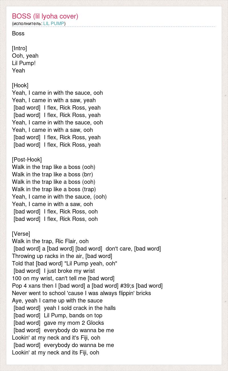 Boss [Intro] Ooh, yeah Lil Pump! Yeah [Hook] Yeah, I came in with the sauce, ooh Yeah, I came in with a saw, yeah [bad word] I flex, Rick Ross, yeah [bad word] I flex, Rick Ross, yeah Yeah, I came in with the sauce, ooh Yeah, I came in with a saw, ooh [bad word] I flex, Rick Ross, yeah [bad word] I flex, Rick Ross, yeah [Post-Hook] Walk in the trap like a boss (ooh) Walk in the trap like a boss (brr) Walk in the trap like a boss (ooh) Walk in the trap like a boss (trap) Yeah, I came in with the sauce, (ooh) Yeah, I came in with a saw, ooh [bad word] I flex, Rick Ross, ooh [bad word] I flex, Rick Ross, ooh [Verse] Walk in the trap, Ric Flair, ooh [bad word] a [bad word] [bad word] don't care, [bad word] Throwing up racks in the air, [bad word] Told that [bad word] "Lil Pump yeah, ooh" [bad word] I just broke my wrist 100 on my wrist, can't tell me [bad word] Pop 4 xans then I [bad word] a [bad word] #39;s [bad word] Never went to school 'cause I was always flippin' bricks Aye, yeah I came up with the sauce [bad word] yeah I sold crack in the halls [bad word] Lil Pump, bands on top [bad word] gave my mom 2 Glocks [bad word] everybody do wanna be me Lookin' at my neck and it's Fiji, ooh [bad word] everybody do wanna be me Lookin' at my neck and its Fiji, ooh