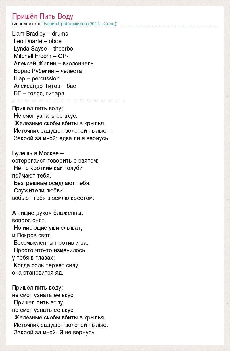 Liam Bradley – drums Leo Duarte – oboe Lynda Sayse – theorbo Mitchell Froom – OP-1 Алексей Жилин – виолончель Борис Рубекин – челеста Шар – percussion Александр Титов – бас БГ – голос, гитара ================================= Пришел пить воду; Не смог узнать ее вкус. Железные скобы вбиты в крылья, Источник задушен золотой пылью – Закрой за мной; едва ли я вернусь. Будешь в Москве – остерегайся говорить о святом; Не то кроткие как голуби поймают тебя, Безгрешные оседлают тебя, Служители любви вобьют тебя в землю крестом. А нищие духом блаженны, вопрос снят. Но имеющие уши слышат, и Покров свят. Бессмысленны против и за, Просто что-то изменилось у тебя в глазах; Когда соль теряет силу, она становится яд. Пришел пить воду; не смог узнать ее вкус. Пришел пить воду; не смог узнать ее вкус. Железные скобы вбиты в крылья, Источник задушен золотой пылью. Закрой за мной. Я не вернусь.