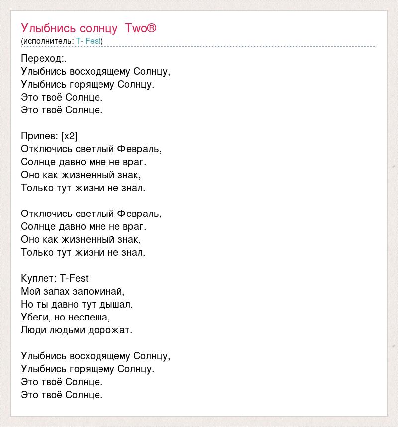 Переход:. Улыбнись восходящему Солнцу, Улыбнись горящему Солнцу. Это твоё Солнце. Это твоё Солнце. Припев: [x2] Отключись светлый Февраль, Солнце давно мне не враг. Оно как жизненный знак, Только тут жизни не знал. Отключись светлый Февраль, Солнце давно мне не враг. Оно как жизненный знак, Только тут жизни не знал. Куплет: T-Fest Мой запах запоминай, Но ты давно тут дышал. Убеги, но неспеша, Люди людьми дорожат. Улыбнись восходящему Солнцу, Улыбнись горящему Солнцу. Это твоё Солнце. Это твоё Солнце.