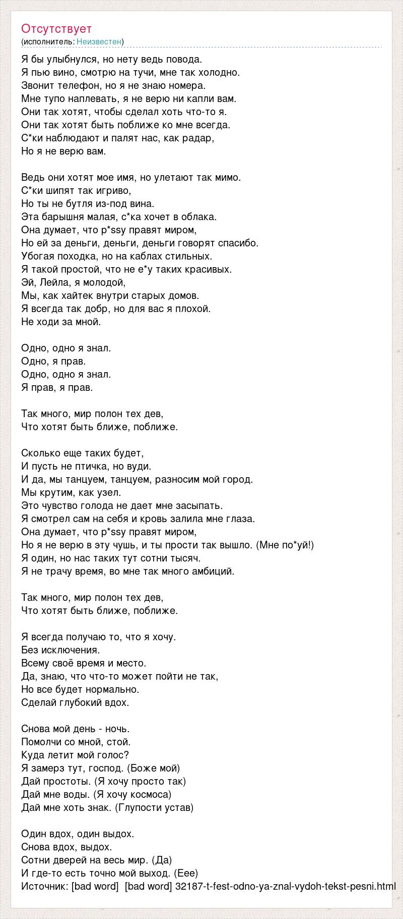 Я бы улыбнулся, но нету ведь повода. Я пью вино, смотрю на тучи, мне так холодно. Звонит телефон, но я не знаю номера. Мне тупо наплевать, я не верю ни капли вам. Они так хотят, чтобы сделал хоть что-то я. Они так хотят быть поближе ко мне всегда. С*ки наблюдают и палят нас, как радар, Но я не верю вам. Ведь они хотят мое имя, но улетают так мимо. С*ки шипят так игриво, Но ты не бутля из-под вина. Эта барышня малая, с*ка хочет в облака. Она думает, что p*ssy правят миром, Но ей за деньги, деньги, деньги говорят спасибо. Убогая походка, но на каблах стильных. Я такой простой, что не е*у таких красивых. Эй, Лейла, я молодой, Мы, как хайтек внутри старых домов. Я всегда так добр, но для вас я плохой. Не ходи за мной. Одно, одно я знал. Одно, я прав. Одно, одно я знал. Я прав, я прав. Так много, мир полон тех дев, Что хотят быть ближе, поближе. Сколько еще таких будет, И пусть не птичка, но вуди. И да, мы танцуем, танцуем, разносим мой город. Мы крутим, как узел. Это чувство голода не дает мне засыпать. Я смотрел сам на себя и кровь залила мне глаза. Она думает, что p*ssy правят миром, Но я не верю в эту чушь, и ты прости так вышло. (Мне по*уй!) Я один, но нас таких тут сотни тысяч. Я не трачу время, во мне так много амбиций. Так много, мир полон тех дев, Что хотят быть ближе, поближе. Я всегда получаю то, что я хочу. Без исключения. Всему своё время и место. Да, знаю, что что-то может пойти не так, Но все будет нормально. Сделай глубокий вдох. Снова мой день - ночь. Помолчи со мной, стой. Куда летит мой голос? Я замерз тут, господ. (Боже мой) Дай простоты. (Я хочу просто так) Дай мне воды. (Я хочу космоса) Дай мне хоть знак. (Глупости устав) Один вдох, один выдох. Снова вдох, выдох. Сотни дверей на весь мир. (Да) И где-то есть точно мой выход. (Еее) Источник: [bad word] [bad word] 32187-t-fest-odno-ya-znal-vydoh-tekst-pesni.html