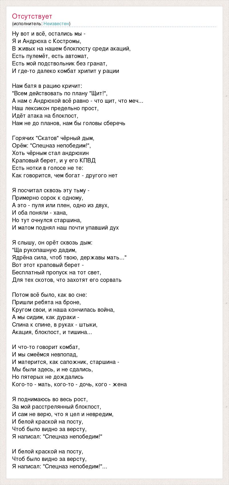 Ну вот и всё, остались мы - Я и Андрюха с Костромы, В живых на нашем блокпосту среди акаций, Есть пулемёт, есть автомат, Есть мой подствольник без гранат, И где-то далеко комбат хрипит у рации Нам батя в рацию кричит: "Всем действовать по плану "Щит!", А нам с Андрюхой всё равно - что щит, что меч... Наш лексикон предельно прост, Идёт атака на блокпост, Нам не до планов, нам бы головы сберечь Горячих "Скатов" чёрный дым, Орём: "Спецназ непобедим!", Хоть чёрным стал андрюхин Краповый берет, и у его КПВД Есть нотки в голосе не те: Как говорится, чем богат - другого нет Я посчитал сквозь эту тьму - Примерно сорок к одному, А это - пуля или плен, одно из двух, И оба поняли - хана, Но тут очнулся старшина, И матом поднял наш почти упавший дух Я слышу, он орёт сквозь дым: "Ща рукопашную дадим, Ядрёна сила, чтоб твою, державы мать..." Вот этот краповый берет - Бесплатный пропуск на тот свет, Для тех скотов, что захотят его сорвать Потом всё было, как во сне: Пришли ребята на броне, Кругом свои, и наша кончилась война, А мы сидим, как дураки - Спина к спине, в руках - штыки, Акация, блокпост, и тишина... И что-то говорит комбат, И мы смеёмся невпопад, И матерится, как сапожник, старшина - Мы были здесь, и не сдались, Но пятерых не дождались Кого-то - мать, кого-то - дочь, кого - жена Я поднимаюсь во весь рост, За мой расстрелянный блокпост, И сам не верю, что я цел и невредим, И белой краской на посту, Чтоб было видно за версту, Я написал: "Спецназ непобедим!" И белой краской на посту, Чтоб было видно за версту, Я написал: "Спецназ непобедим!"...