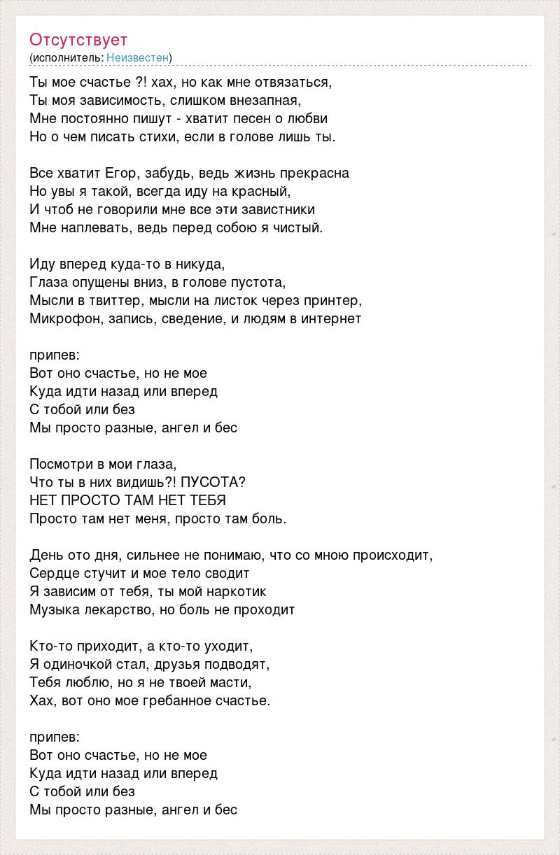 Ты мое счастье ?! хах, но как мне отвязаться, Ты моя зависимость, слишком внезапная, Мне постоянно пишут - хватит песен о любви Но о чем писать стихи, если в голове лишь ты. Все хватит Егор, забудь, ведь жизнь прекрасна Но увы я такой, всегда иду на красный, И чтоб не говорили мне все эти завистники Мне наплевать, ведь перед собою я чистый. Иду вперед куда-то в никуда, Глаза опущены вниз, в голове пустота, Мысли в твиттер, мысли на листок через принтер, Микрофон, запись, сведение, и людям в интернет припев: Вот оно счастье, но не мое Куда идти назад или вперед С тобой или без Мы просто разные, ангел и бес Посмотри в мои глаза, Что ты в них видишь?! ПУСОТА? НЕТ ПРОСТО ТАМ НЕТ ТЕБЯ Просто там нет меня, просто там боль. День ото дня, сильнее не понимаю, что со мною происходит, Сердце стучит и мое тело сводит Я зависим от тебя, ты мой наркотик Музыка лекарство, но боль не проходит Кто-то приходит, а кто-то уходит, Я одиночкой стал, друзья подводят, Тебя люблю, но я не твоей масти, Хах, вот оно мое гребанное счастье. припев: Вот оно счастье, но не мое Куда идти назад или вперед С тобой или без Мы просто разные, ангел и бес