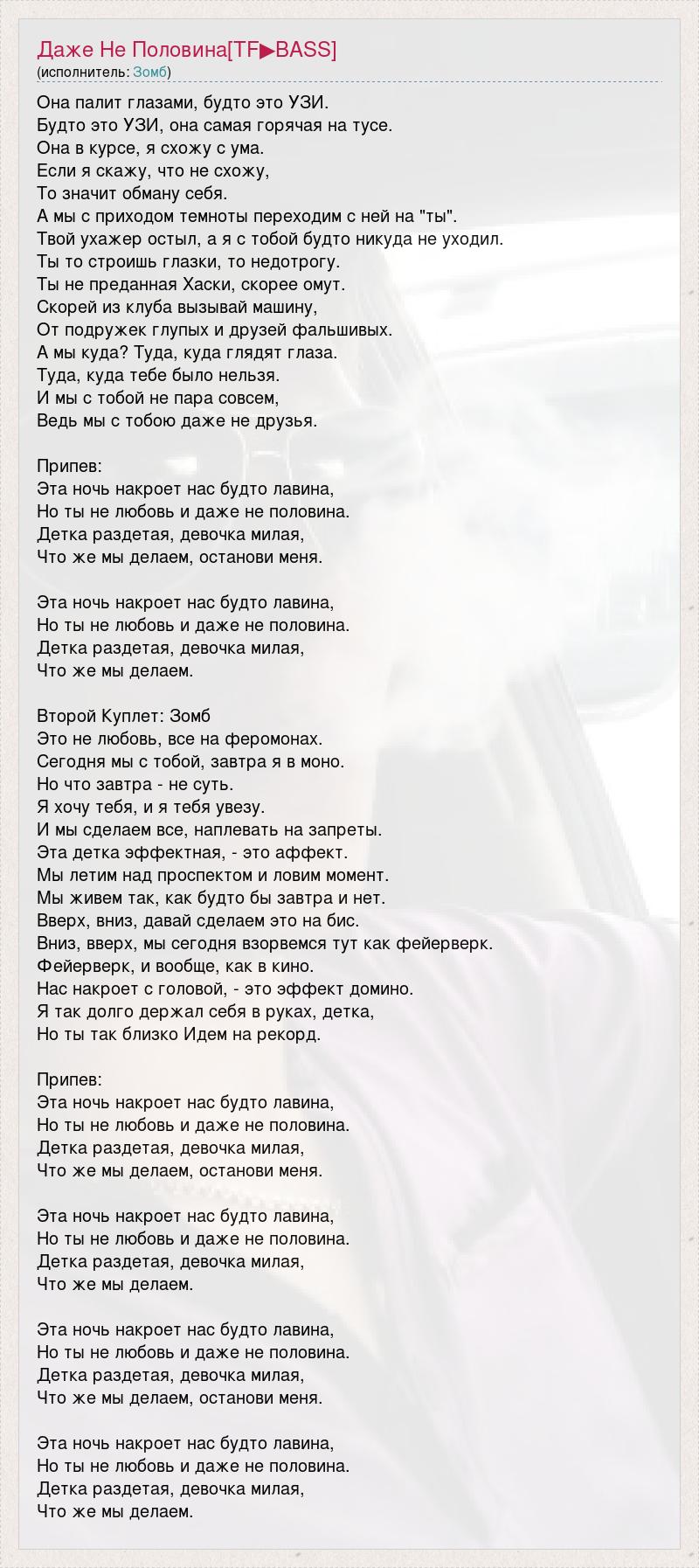 Она палит глазами, будто это УЗИ. Будто это УЗИ, она самая горячая на тусе. Она в курсе, я схожу с ума. Если я скажу, что не схожу, То значит обману себя. А мы с приходом темноты переходим с ней на "ты". Твой ухажер остыл, а я с тобой будто никуда не уходил. Ты то строишь глазки, то недотрогу. Ты не преданная Хаски, скорее омут. Скорей из клуба вызывай машину, От подружек глупых и друзей фальшивых. А мы куда? Туда, куда глядят глаза. Туда, куда тебе было нельзя. И мы с тобой не пара совсем, Ведь мы с тобою даже не друзья. Припев: Эта ночь накроет нас будто лавина, Но ты не любовь и даже не половина. Детка раздетая, девочка милая, Что же мы делаем, останови меня. Эта ночь накроет нас будто лавина, Но ты не любовь и даже не половина. Детка раздетая, девочка милая, Что же мы делаем. Второй Куплет: Зомб Это не любовь, все на феромонах. Сегодня мы с тобой, завтра я в моно. Но что завтра - не суть. Я хочу тебя, и я тебя увезу. И мы сделаем все, наплевать на запреты. Эта детка эффектная, - это аффект. Мы летим над проспектом и ловим момент. Мы живем так, как будто бы завтра и нет. Вверх, вниз, давай сделаем это на бис. Вниз, вверх, мы сегодня взорвемся тут как фейерверк. Фейерверк, и вообще, как в кино. Нас накроет с головой, - это эффект домино. Я так долго держал себя в руках, детка, Но ты так близко Идем на рекорд. Припев: Эта ночь накроет нас будто лавина, Но ты не любовь и даже не половина. Детка раздетая, девочка милая, Что же мы делаем, останови меня. Эта ночь накроет нас будто лавина, Но ты не любовь и даже не половина. Детка раздетая, девочка милая, Что же мы делаем. Эта ночь накроет нас будто лавина, Но ты не любовь и даже не половина. Детка раздетая, девочка милая, Что же мы делаем, останови меня. Эта ночь накроет нас будто лавина, Но ты не любовь и даже не половина. Детка раздетая, девочка милая, Что же мы делаем.