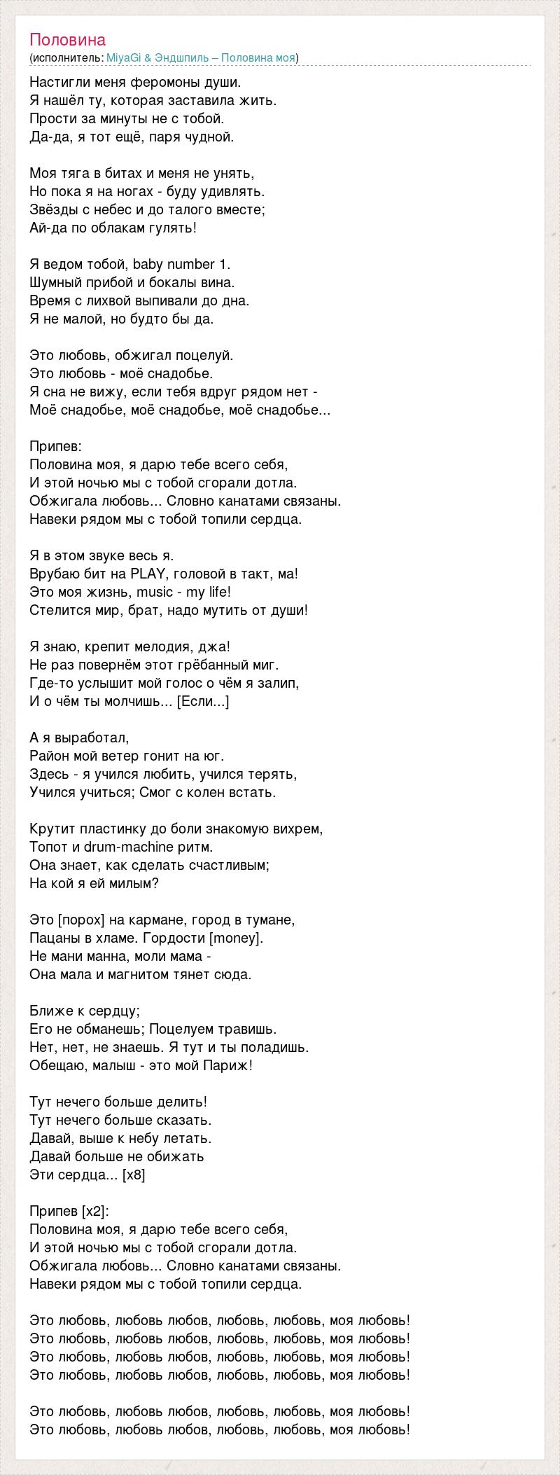 Настигли меня феромоны души. Я нашёл ту, которая заставила жить. Прости за минуты не с тобой. Да-да, я тот ещё, паря чудной. Моя тяга в битах и меня не унять, Но пока я на ногах - буду удивлять. Звёзды с небес и до талого вместе; Ай-да по облакам гулять! Я ведом тобой, baby number 1. Шумный прибой и бокалы вина. Время с лихвой выпивали до дна. Я не малой, но будто бы да. Это любовь, обжигал поцелуй. Это любовь - моё снадобье. Я сна не вижу, если тебя вдруг рядом нет - Моё снадобье, моё снадобье, моё снадобье... Припев: Половина моя, я дарю тебе всего себя, И этой ночью мы с тобой сгорали дотла. Обжигала любовь... Словно канатами связаны. Навеки рядом мы с тобой топили сердца. Я в этом звуке весь я. Врубаю бит на PLAY, головой в такт, ма! Это моя жизнь, music - my life! Стелится мир, брат, надо мутить от души! Я знаю, крепит мелодия, джа! Не раз повернём этот грёбанный миг. Где-то услышит мой голос о чём я залип, И о чём ты молчишь... [Если...] А я выработал, Район мой ветер гонит на юг. Здесь - я учился любить, учился терять, Учился учиться; Смог с колен встать. Крутит пластинку до боли знакомую вихрем, Топот и drum-machine ритм. Она знает, как сделать счастливым; На кой я ей милым? Это [порох] на кармане, город в тумане, Пацаны в хламе. Гордости [money]. Не мани манна, моли мама - Она мала и магнитом тянет сюда. Ближе к сердцу; Его не обманешь; Поцелуем травишь. Нет, нет, не знаешь. Я тут и ты поладишь. Обещаю, малыш - это мой Париж! Тут нечего больше делить! Тут нечего больше сказать. Давай, выше к небу летать. Давай больше не обижать Эти сердца... [x8] Припев [x2]: Половина моя, я дарю тебе всего себя, И этой ночью мы с тобой сгорали дотла. Обжигала любовь... Словно канатами связаны. Навеки рядом мы с тобой топили сердца. Это любовь, любовь любов, любовь, любовь, моя любовь! Это любовь, любовь любов, любовь, любовь, моя любовь! Это любовь, любовь любов, любовь, любовь, моя любовь! Это любовь, любовь любов, любовь, любовь, моя любовь! Это любовь, любовь любов, любовь, любовь, моя любовь! Это любовь, любовь любов, любовь, любовь, моя любовь!