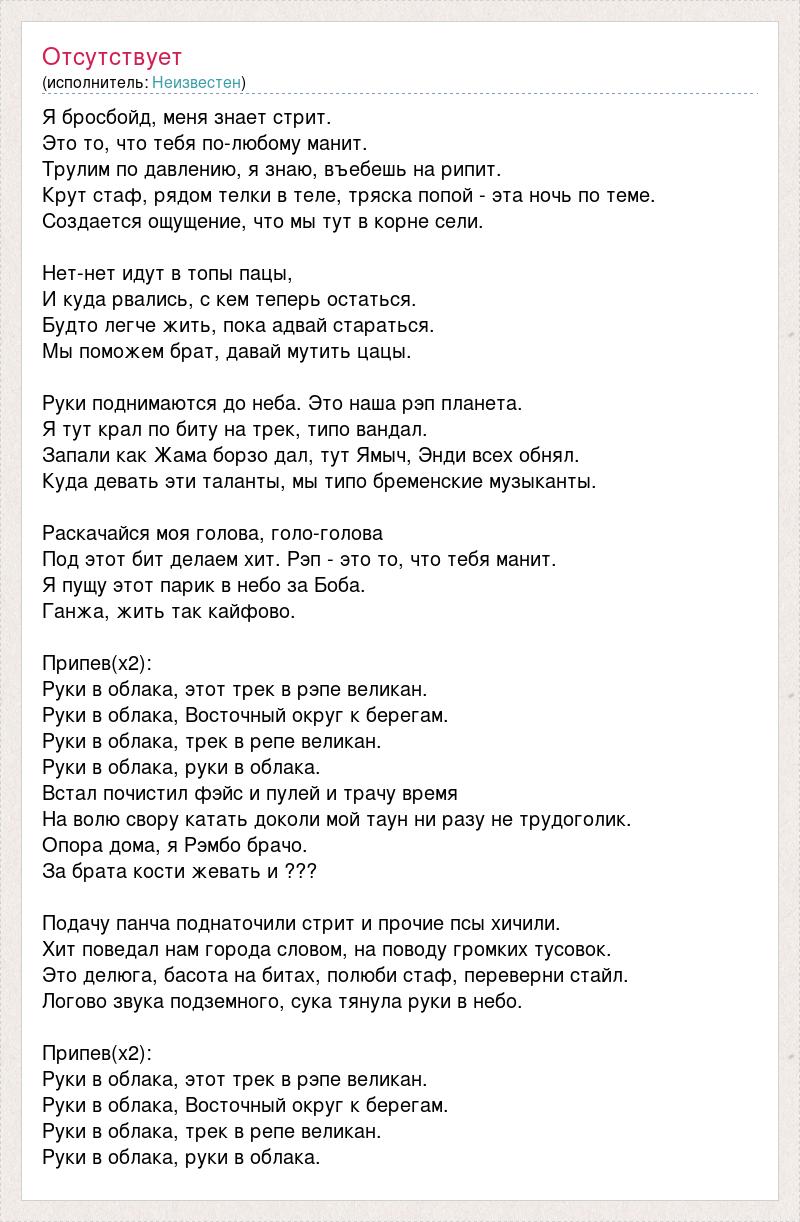 Я бросбойд, меня знает стрит. Это то, что тебя по-любому манит. Трулим по давлению, я знаю, въебешь на рипит. Крут стаф, рядом телки в теле, тряска попой - эта ночь по теме. Создается ощущение, что мы тут в корне сели. Нет-нет идут в топы пацы, И куда рвались, с кем теперь остаться. Будто легче жить, пока адвай стараться. Мы поможем брат, давай мутить цацы. Руки поднимаются до неба. Это наша рэп планета. Я тут крал по биту на трек, типо вандал. Запали как Жама борзо дал, тут Ямыч, Энди всех обнял. Куда девать эти таланты, мы типо бременские музыканты. Раскачайся моя голова, голо-голова Под этот бит делаем хит. Рэп - это то, что тебя манит. Я пущу этот парик в небо за Боба. Ганжа, жить так кайфово. Припев(х2): Руки в облака, этот трек в рэпе великан. Руки в облака, Восточный округ к берегам. Руки в облака, трек в репе великан. Руки в облака, руки в облака. Встал почистил фэйс и пулей и трачу время На волю свору катать доколи мой таун ни разу не трудоголик. Опора дома, я Рэмбо брачо. За брата кости жевать и ??? Подачу панча поднаточили стрит и прочие псы хичили. Хит поведал нам города словом, на поводу громких тусовок. Это делюга, басота на битах, полюби стаф, переверни стайл. Логово звука подземного, сука тянула руки в небо. Припев(х2): Руки в облака, этот трек в рэпе великан. Руки в облака, Восточный округ к берегам. Руки в облака, трек в репе великан. Руки в облака, руки в облака.