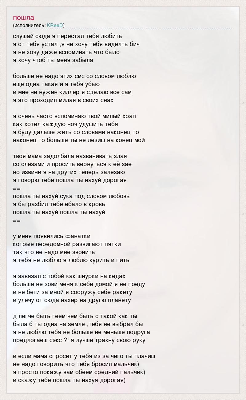 cлушай сюда я перестал тебя любить я от тебя устал ,я не хочу тебя виделть бич я не хочу даже вспоминать что было я хочу чтоб ты меня забыла больше не надо этих смс со словом люблю еще одна такая и я тебя убью и мне не нужен киллер я сделаю все сам я это проходил милая в своих снах я очень часто вспоминаю твой милый храп как хотел каждую ноч удушить тебя я буду дальше жить со словами наконец то наконец то больше ты не лезиш на конец мой твоя мама задолбала названивать злая со слезами и просить вернуться к её зае но извини я на других теперь залезаю я говорю тебе пошла ты нахуй дорогая == пошла ты нахуй сука под словом любовь я бы разбил тебе ебало в кровь пошла ты нахуй пошла ты нахуй == у меня появились фанатки котрые передомной развигают пятки так что не надо мне звонить я тебя не люблю я люблю курить и пить я завязал с тобой как шнурки на кедах больше не зови меня к себе домой я не поеду и не беги за мной я сооружу себе ракету и улечу от сюда нахер на другю планету д легче быть геем чем быть с такой как ты была б ты одна на земле ,тебя не выбрал бы я не люблю тебя не больше не меньше подруга предлогаеш сэкс ?! я лучше трахну свою руку и если мама спросит у тебя из за чего ты плачиш не надо говорить что тебя бросил мальчик) я просто покажу вам обеем средний пальчик) и скажу тебе пошла ты нахуя дорогая)