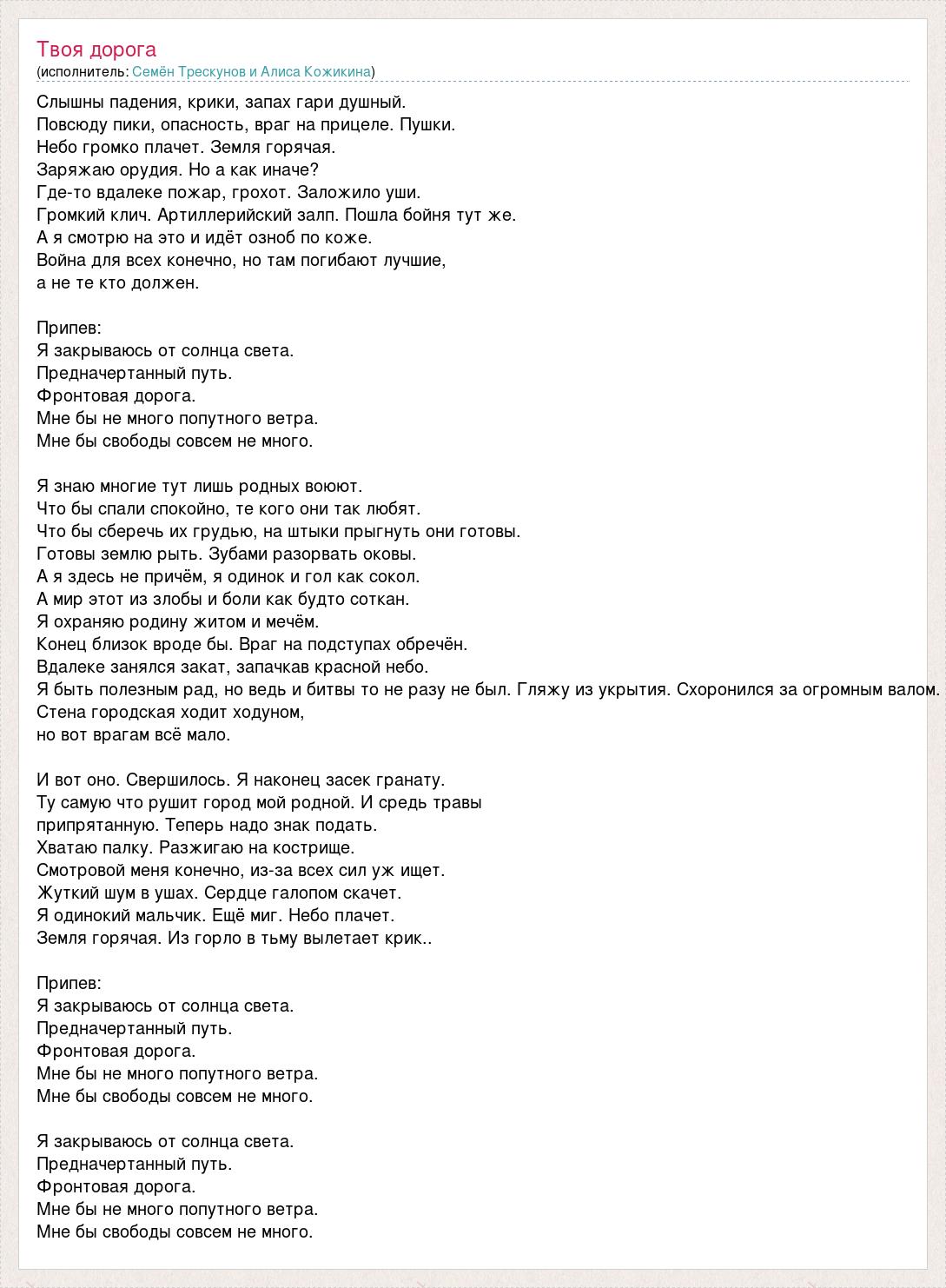 Слышны падения, крики, запах гари душный. Повсюду пики, опасность, враг на прицеле. Пушки. Небо громко плачет. Земля горячая. Заряжаю орудия. Но а как иначе? Где-то вдалеке пожар, грохот. Заложило уши. Громкий клич. Артиллерийский залп. Пошла бойня тут же. А я смотрю на это и идёт озноб по коже. Война для всех конечно, но там погибают лучшие, а не те кто должен. Припев: Я закрываюсь от солнца света. Предначертанный путь. Фронтовая дорога. Мне бы не много попутного ветра. Мне бы свободы совсем не много. Я знаю многие тут лишь родных воюют. Что бы спали спокойно, те кого они так любят. Что бы сберечь их грудью, на штыки прыгнуть они готовы. Готовы землю рыть. Зубами разорвать оковы. А я здесь не причём, я одинок и гол как сокол. А мир этот из злобы и боли как будто соткан. Я охраняю родину житом и мечём. Конец близок вроде бы. Враг на подступах обречён. Вдалеке занялся закат, запачкав красной небо. Я быть полезным рад, но ведь и битвы то не разу не был. Гляжу из укрытия. Схоронился за огромным валом. Стена городская ходит ходуном, но вот врагам всё мало. И вот оно. Свершилось. Я наконец засек гранату. Ту самую что рушит город мой родной. И средь травы припрятанную. Теперь надо знак подать. Хватаю палку. Разжигаю на кострище. Смотровой меня конечно, из-за всех сил уж ищет. Жуткий шум в ушах. Сердце галопом скачет. Я одинокий мальчик. Ещё миг. Небо плачет. Земля горячая. Из горло в тьму вылетает крик.. Припев: Я закрываюсь от солнца света. Предначертанный путь. Фронтовая дорога. Мне бы не много попутного ветра. Мне бы свободы совсем не много. Я закрываюсь от солнца света. Предначертанный путь. Фронтовая дорога. Мне бы не много попутного ветра. Мне бы свободы совсем не много.