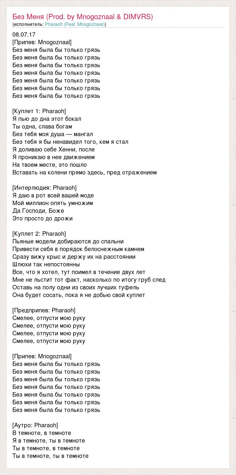 08.07.17 [Припев: Mnogoznaal] Без меня была бы только грязь Без меня была бы только грязь Без меня была бы только грязь Без меня была бы только грязь Без меня была бы только грязь Без меня была бы только грязь Без меня была бы только грязь [Куплет 1: Pharaoh] Я пью до дна этот бокал Ты одна, слава богам Без тебя моя душа — мангал Без тебя я бы ненавидел того, кем я стал Я доливаю себе Хенни, после Я проникаю в нее движением На твоем месте, это пошло Вставать на колени прямо здесь, пред отражением [Интерлюдия: Pharaoh] Я даю в рот всей вашей моде Мой миллион опять умножим Да Господи, Боже Это просто до дрожи [Куплет 2: Pharaoh] Пьяные модели добираются до спальни Привести себя в порядок белоснежным камнем Сразу вижу крыс и держу их на расстоянии Шлюхи так непостоянны Все, что я хотел, тут поимел в течение двух лет Мне не льстит тот факт, насколько по итогу груб след Оставь на полу одни из своих лучших туфель Она будет сосать, пока я не добью свой куплет [Предприпев: Pharaoh] Смелее, отпусти мою руку Смелее, отпусти мою руку Смелее, отпусти мою руку Смелее, отпусти мою руку [Припев: Mnogoznaal] Без меня была бы только грязь Без меня была бы только грязь Без меня была бы только грязь Без меня была бы только грязь Без меня была бы только грязь Без меня была бы только грязь Без меня была бы только грязь [Аутро: Pharaoh] В темноте, в темноте Я в темноте, ты в темноте Ты в темноте, в темноте Ты в темноте, ты в темноте