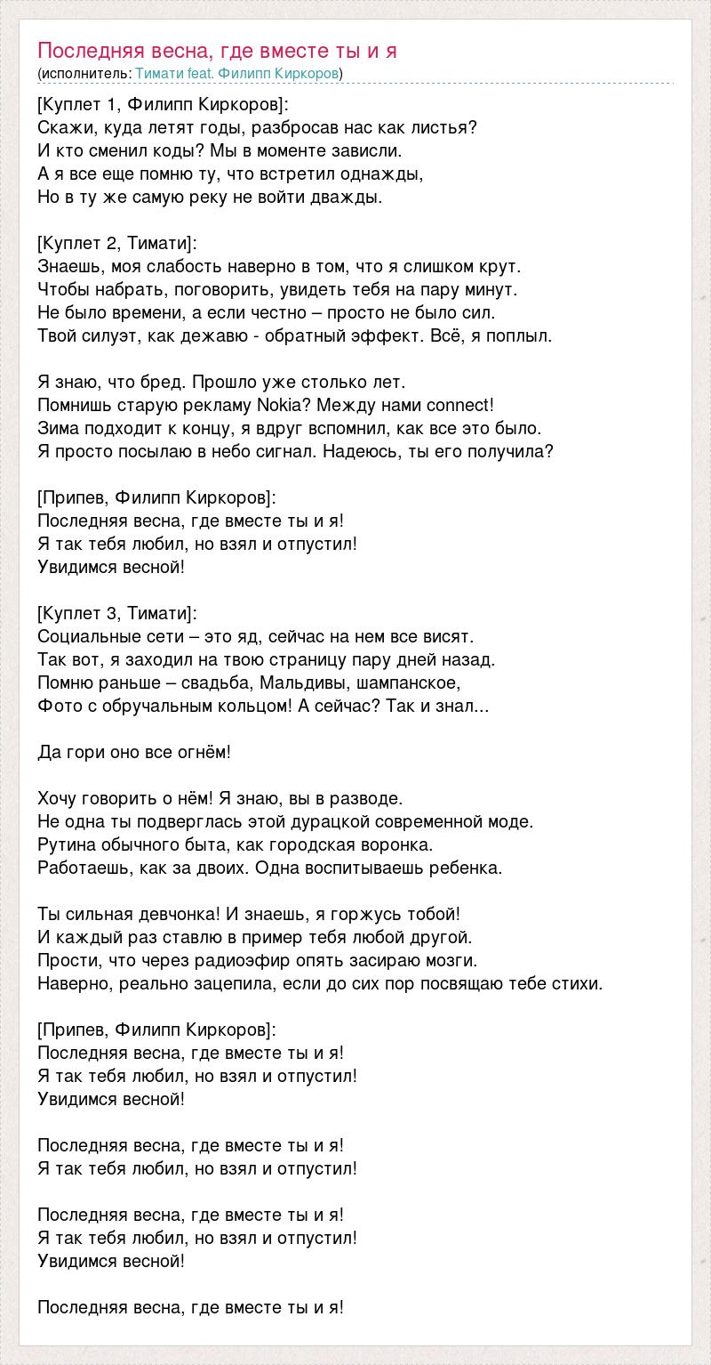 [Куплет 1, Филипп Киркоров]: Скажи, куда летят годы, разбросав нас как листья? И кто сменил коды? Мы в моменте зависли. А я все еще помню ту, что встретил однажды, Но в ту же самую реку не войти дважды. [Куплет 2, Тимати]: Знаешь, моя слабость наверно в том, что я слишком крут. Чтобы набрать, поговорить, увидеть тебя на пару минут. Не было времени, а если честно – просто не было сил. Твой силуэт, как дежавю - обратный эффект. Всё, я поплыл. Я знаю, что бред. Прошло уже столько лет. Помнишь старую рекламу Nokia? Между нами connect! Зима подходит к концу, я вдруг вспомнил, как все это было. Я просто посылаю в небо сигнал. Надеюсь, ты его получила? [Припев, Филипп Киркоров]: Последняя весна, где вместе ты и я! Я так тебя любил, но взял и отпустил! Увидимся весной! [Куплет 3, Тимати]: Социальные сети – это яд, сейчас на нем все висят. Так вот, я заходил на твою страницу пару дней назад. Помню раньше – свадьба, Мальдивы, шампанское, Фото с обручальным кольцом! А сейчас? Так и знал... Да гори оно все огнём! Хочу говорить о нём! Я знаю, вы в разводе. Не одна ты подверглась этой дурацкой современной моде. Рутина обычного быта, как городская воронка. Работаешь, как за двоих. Одна воспитываешь ребенка. Ты сильная девчонка! И знаешь, я горжусь тобой! И каждый раз ставлю в пример тебя любой другой. Прости, что через радиоэфир опять засираю мозги. Наверно, реально зацепила, если до сих пор посвящаю тебе стихи. [Припев, Филипп Киркоров]: Последняя весна, где вместе ты и я! Я так тебя любил, но взял и отпустил! Увидимся весной! Последняя весна, где вместе ты и я! Я так тебя любил, но взял и отпустил! Последняя весна, где вместе ты и я! Я так тебя любил, но взял и отпустил! Увидимся весной! Последняя весна, где вместе ты и я!