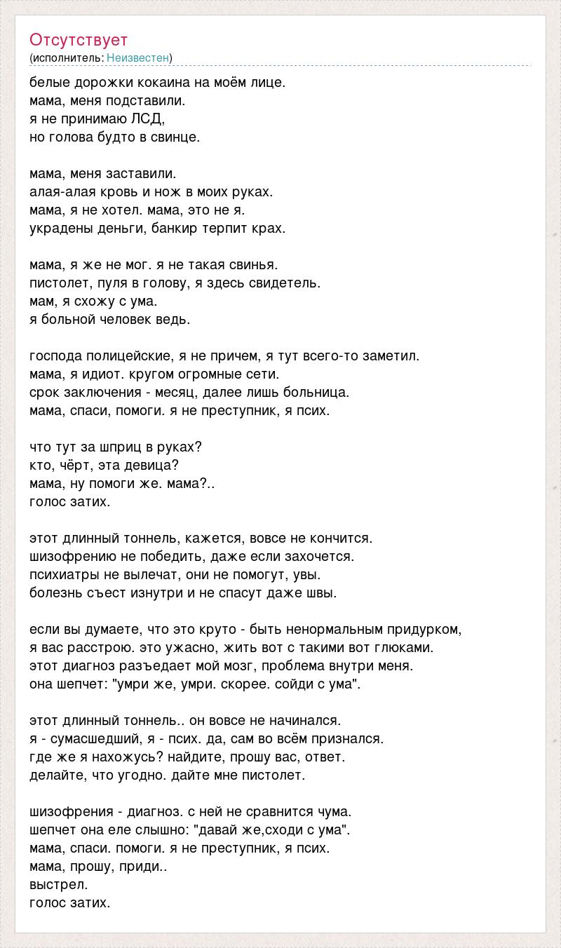 белые дорожки кокаина на моём лице. мама, меня подставили. я не принимаю ЛСД, но голова будто в свинце. мама, меня заставили. алая-алая кровь и нож в моих руках. мама, я не хотел. мама, это не я. украдены деньги, банкир терпит крах. мама, я же не мог. я не такая свинья. пистолет, пуля в голову, я здесь свидетель. мам, я схожу с ума. я больной человек ведь. господа полицейские, я не причем, я тут всего-то заметил. мама, я идиот. кругом огромные сети. срок заключения - месяц, далее лишь больница. мама, спаси, помоги. я не преступник, я псих. что тут за шприц в руках? кто, чёрт, эта девица? мама, ну помоги же. мама?.. голос затих. этот длинный тоннель, кажется, вовсе не кончится. шизофрению не победить, даже если захочется. психиатры не вылечат, они не помогут, увы. болезнь съест изнутри и не спасут даже швы. если вы думаете, что это круто - быть ненормальным придурком, я вас расстрою. это ужасно, жить вот с такими вот глюками. этот диагноз разъедает мой мозг, проблема внутри меня. она шепчет: "умри же, умри. скорее. сойди с ума". этот длинный тоннель.. он вовсе не начинался. я - сумасшедший, я - псих. да, сам во всём признался. где же я нахожусь? найдите, прошу вас, ответ. делайте, что угодно. дайте мне пистолет. шизофрения - диагноз. с ней не сравнится чума. шепчет она еле слышно: "давай же,сходи с ума". мама, спаси. помоги. я не преступник, я псих. мама, прошу, приди.. выстрел. голос затих.