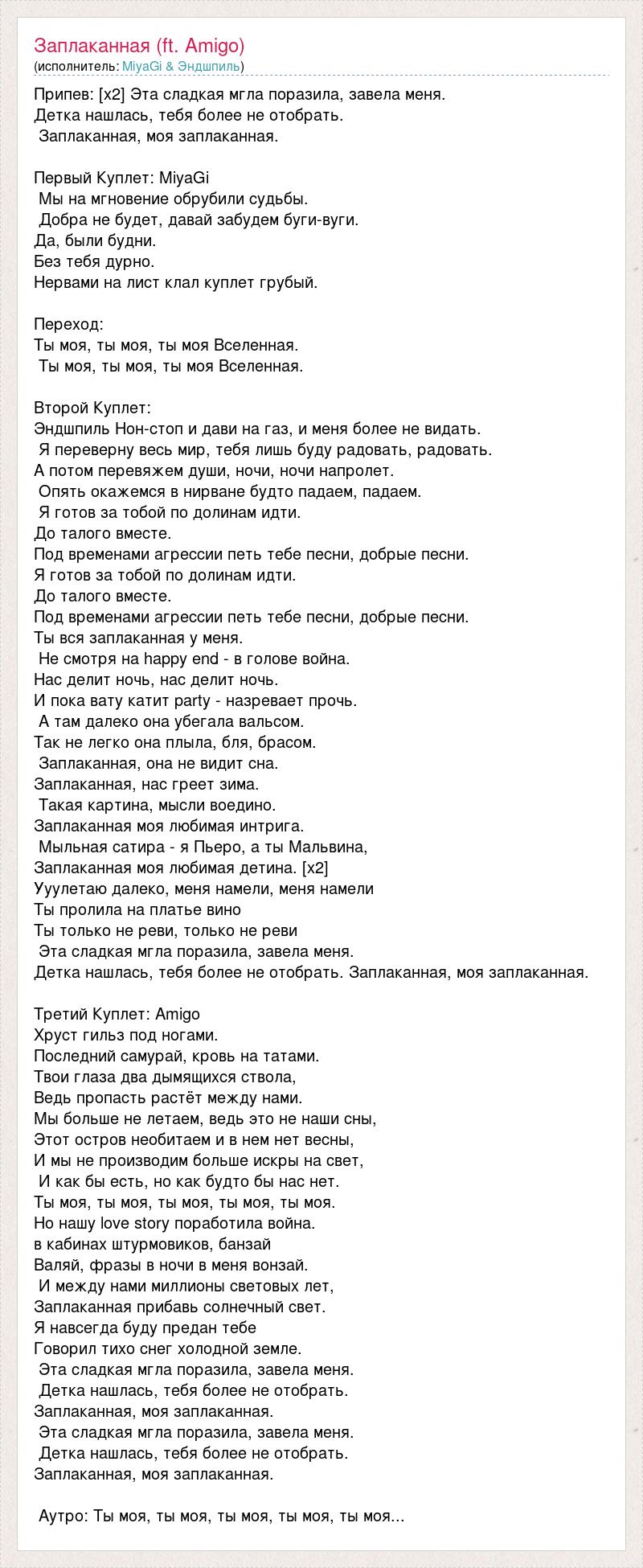 Припев: [x2] Эта сладкая мгла поразила, завела меня. Детка нашлась, тебя более не отобрать. Заплаканная, моя заплаканная. Первый Куплет: MiyaGi Мы на мгновение обрубили судьбы. Добра не будет, давай забудем буги-вуги. Да, были будни. Без тебя дурно. Нервами на лист клал куплет грубый. Переход: Ты моя, ты моя, ты моя Вселенная. Ты моя, ты моя, ты моя Вселенная. Второй Куплет: Эндшпиль Нон-стоп и дави на газ, и меня более не видать. Я переверну весь мир, тебя лишь буду радовать, радовать. А потом перевяжем души, ночи, ночи напролет. Опять окажемся в нирване будто падаем, падаем. Я готов за тобой по долинам идти. До талого вместе. Под временами агрессии петь тебе песни, добрые песни. Я готов за тобой по долинам идти. До талого вместе. Под временами агрессии петь тебе песни, добрые песни. Ты вся заплаканная у меня. Не смотря на happy end - в голове война. Нас делит ночь, нас делит ночь. И пока вату катит party - назревает прочь. А там далеко она убегала вальсом. Так не легко она плыла, бля, брасом. Заплаканная, она не видит сна. Заплаканная, нас греет зима. Такая картина, мысли воедино. Заплаканная моя любимая интрига. Мыльная сатира - я Пьеро, а ты Мальвина, Заплаканная моя любимая детина. [x2] Ууулетаю далеко, меня намели, меня намели Ты пролила на платье вино Ты только не реви, только не реви Эта сладкая мгла поразила, завела меня. Детка нашлась, тебя более не отобрать. Заплаканная, моя заплаканная. Третий Куплет: Amigo Хруст гильз под ногами. Последний самурай, кровь на татами. Твои глаза два дымящихся ствола, Ведь пропасть растёт между нами. Мы больше не летаем, ведь это не наши сны, Этот остров необитаем и в нем нет весны, И мы не производим больше искры на свет, И как бы есть, но как будто бы нас нет. Ты моя, ты моя, ты моя, ты моя, ты моя. Но нашу love story поработила война. в кабинах штурмовиков, банзай Валяй, фразы в ночи в меня вонзай. И между нами миллионы световых лет, Заплаканная прибавь солнечный свет. Я навсегда буду предан тебе Говорил тихо снег холодной земле. Эта сладкая мгла поразила, завела меня. Детка нашлась, тебя более не отобрать. Заплаканная, моя заплаканная. Эта сладкая мгла поразила, завела меня. Детка нашлась, тебя более не отобрать. Заплаканная, моя заплаканная. Аутро: Ты моя, ты моя, ты моя, ты моя, ты моя...