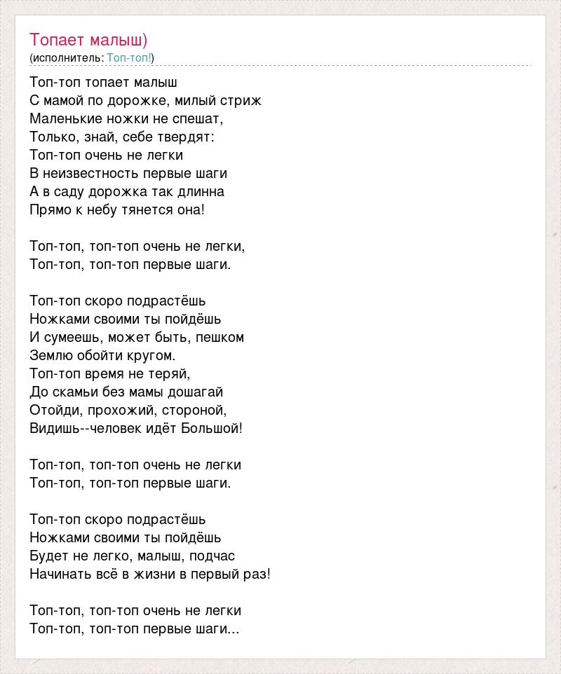 Топ-топ топает малыш С мамой по дорожке, милый стриж Маленькие ножки не спешат, Только, знай, себе твердят: Топ-топ очень не легки В неизвестность первые шаги А в саду дорожка так длинна Прямо к небу тянется она! Топ-топ, топ-топ очень не легки, Топ-топ, топ-топ первые шаги. Топ-топ скоро подрастёшь Ножками своими ты пойдёшь И сумеешь, может быть, пешком Землю обойти кругом. Топ-топ время не теряй, До скамьи без мамы дошагай Отойди, прохожий, стороной, Видишь--человек идёт Большой! Топ-топ, топ-топ очень не легки Топ-топ, топ-топ первые шаги. Топ-топ скоро подрастёшь Ножками своими ты пойдёшь Будет не легко, малыш, подчас Начинать всё в жизни в первый раз! Топ-топ, топ-топ очень не легки Топ-топ, топ-топ первые шаги...