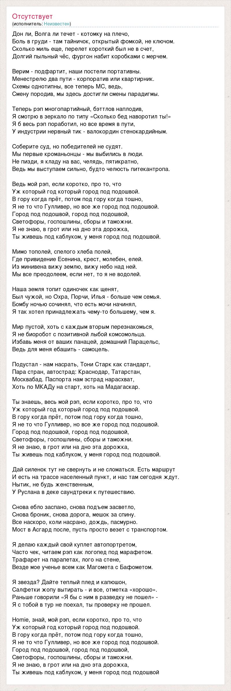 Дон ли, Волга ли течет - котомку на плечо, Боль в груди - там тайничок, открытый фомкой, не ключом. Сколько миль еще, перелет короткий был не в счет, Долгий пыльный чёс, фургон набит коробками с мерчем. Верим - подфартит, наши постели портативны. Менестрелю два пути - корпоратив или квартирник. Схемы однотипны, все теперь MC, ведь, Смену породив, мы здесь достигли смены парадигмы. Теперь рэп многопартийный, бэттлов наплодив, Я смотрю в зеркало по типу «Сколько бед наворотил ты!» Я б весь рэп поработил, но все время в пути, У индустрии нервный тик - валокордин стенокардийным. Соберите суд, но победителей не судят. Мы первые кроманьонцы - мы выбились в люди. Не пизди, я кладу на вас, челядь, пятикратно, Ведь мы выступаем сильно, будто челюсть питекантропа. Ведь мой рэп, если коротко, про то, что Уж который год который город под подошвой. В гору когда прёт, потом под гору когда тошно, Я не то что Гулливер, но все же город под подошвой. Город под подошвой, город под подошвой, Светофоры, госпошлины, сборы и таможни. Я не знаю, в грот или на дно эта дорожка, Ты живешь под каблуком, у меня город под подошвой. Мимо тополей, спелого хлеба полей, Где привидение Есенина, крест, молебен, елей. Из минивена вижу землю, вижу небо над ней. Мы все преодолеем, если нет, то я не водолей. Наша земля топит одиночек как щенят, Был чужой, но Охра, Порчи, Илья - больше чем семья. Бомбу ночью сочинял, что есть мочи начинял, Я так хотел принадлежать чему-то большему, чем я. Мир пустой, хоть с каждым вторым перезнакомься, Я не биоробот с позитивной лыбой комсомольца. Избавь меня от ваших панацей, домашний Парацельс, Ведь для меня ебашить - самоцель. Подустал - нам насрать, Тони Старк как стандарт, Пара стран, автострад: Краснодар, Татарстан, Москвабад. Паспорта нам эстрад нарасхват, Хоть по МКАДу на старт, хоть на Мадагаскар. Ты знаешь, весь мой рэп, если коротко, про то, что Уж который год который город под подошвой. В гору когда прёт, потом под гору когда тошно, Я не то что Гулливер, но все же город под подошвой. Город под подошвой, город под подошвой, Светофоры, госпошлины, сборы и таможни. Я не знаю, в грот или на дно эта дорожка, Ты живешь под каблуком, у меня город под подошвой. Дай силенок тут не свернуть и не сломаться. Есть маршрут И есть на трассе населенный пункт, и нас там сегодня ждут. Нытик, не будь женственным, У Руслана в деке саундтреки к путешествию. Снова ебло заспано, снова подъем засветло, Снова броник, снова дорога, мешок за спину. Все наскоро, коли насрано, дождь, пасмурно. Мост в Асгард после, пусть просто везет с транспортом. Я делаю каждый свой куплет автопортретом, Часто чек, читаем рэп как логопед под марафетом. Трафарет на парапетах, лого на стене, Везде мое ученье всем как Магомета с Бафометом. Я звезда? Дайте теплый плед и капюшон, Салфетки жопу вытирать - и все, отметка «хорошо». Раньше говорили «Я бы с ним в разведку не пошел» - Я с тобой в тур не поехал, ты проверку не прошел. Homie, знай, мой рэп, если коротко, про то, что Уж который год который город под подошвой. В гору когда прёт, потом под гору когда тошно, Я не то что Гулливер, но все же город под подошвой. Город под подошвой, город под подошвой, Светофоры, госпошлины, сборы и таможни. Я не знаю, в грот или на дно эта дорожка, Ты живешь под каблуком, у меня город под подошвой