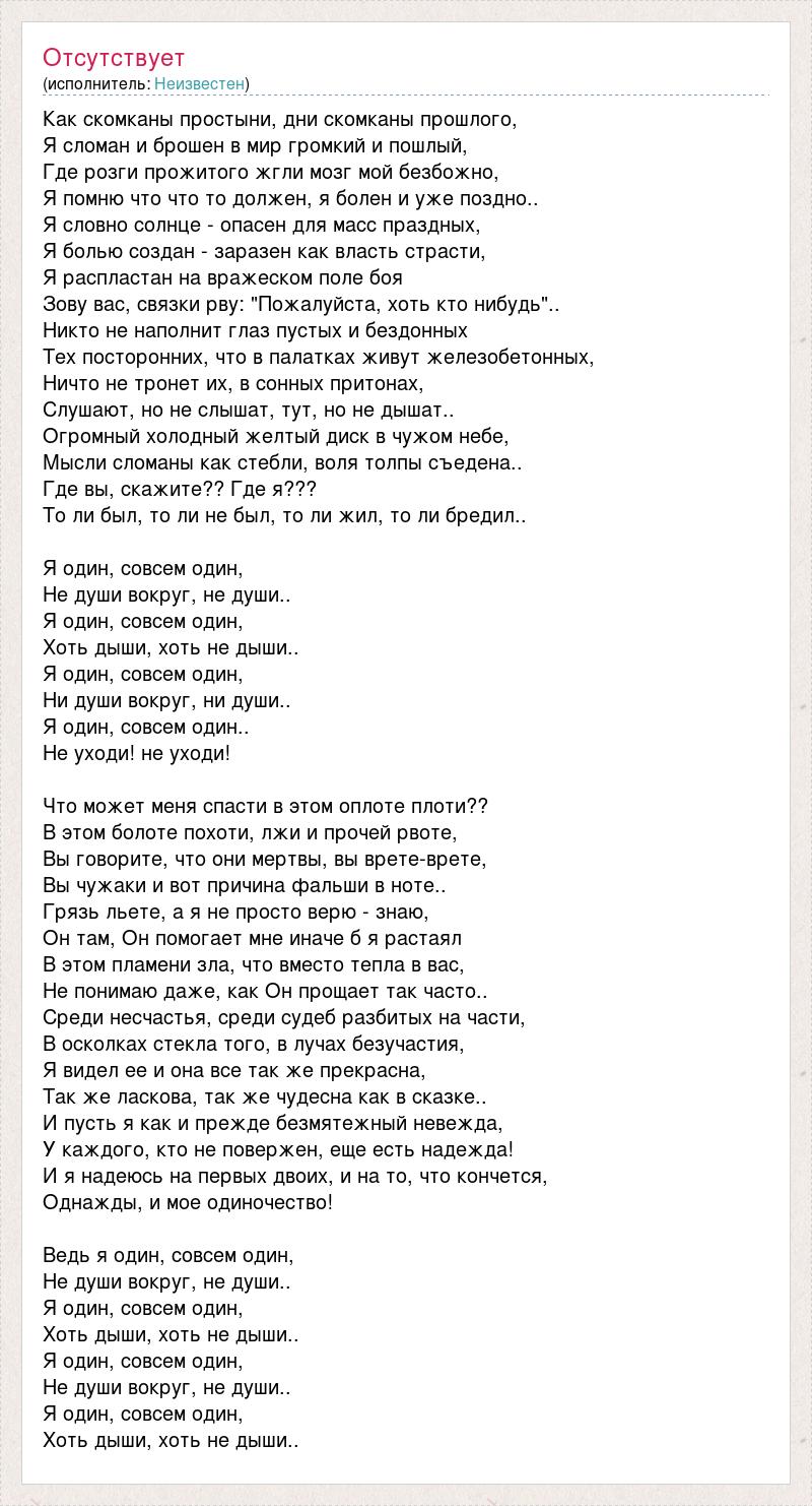 Как скомканы простыни, дни скомканы прошлого, Я сломан и брошен в мир громкий и пошлый, Где розги прожитого жгли мозг мой безбожно, Я помню что что то должен, я болен и уже поздно.. Я словно солнце - опасен для масс праздных, Я болью создан - заразен как власть страсти, Я распластан на вражеском поле боя Зову вас, связки рву: "Пожалуйста, хоть кто нибудь".. Никто не наполнит глаз пустых и бездонных Тех посторонних, что в палатках живут железобетонных, Ничто не тронет их, в сонных притонах, Слушают, но не слышат, тут, но не дышат.. Огромный холодный желтый диск в чужом небе, Мысли сломаны как стебли, воля толпы съедена.. Где вы, скажите?? Где я??? То ли был, то ли не был, то ли жил, то ли бредил.. Я один, совсем один, Не души вокруг, не души.. Я один, совсем один, Хоть дыши, хоть не дыши.. Я один, совсем один, Ни души вокруг, ни души.. Я один, совсем один.. Не уходи! не уходи! Что может меня спасти в этом оплоте плоти?? В этом болоте похоти, лжи и прочей рвоте, Вы говорите, что они мертвы, вы врете-врете, Вы чужаки и вот причина фальши в ноте.. Грязь льете, а я не просто верю - знаю, Он там, Он помогает мне иначе б я растаял В этом пламени зла, что вместо тепла в вас, Не понимаю даже, как Он прощает так часто.. Среди несчастья, среди судеб разбитых на части, В осколках стекла того, в лучах безучастия, Я видел ее и она все так же прекрасна, Так же ласкова, так же чудесна как в сказке.. И пусть я как и прежде безмятежный невежда, У каждого, кто не повержен, еще есть надежда! И я надеюсь на первых двоих, и на то, что кончется, Однажды, и мое одиночество! Ведь я один, совсем один, Не души вокруг, не души.. Я один, совсем один, Хоть дыши, хоть не дыши.. Я один, совсем один, Не души вокруг, не души.. Я один, совсем один, Хоть дыши, хоть не дыши..