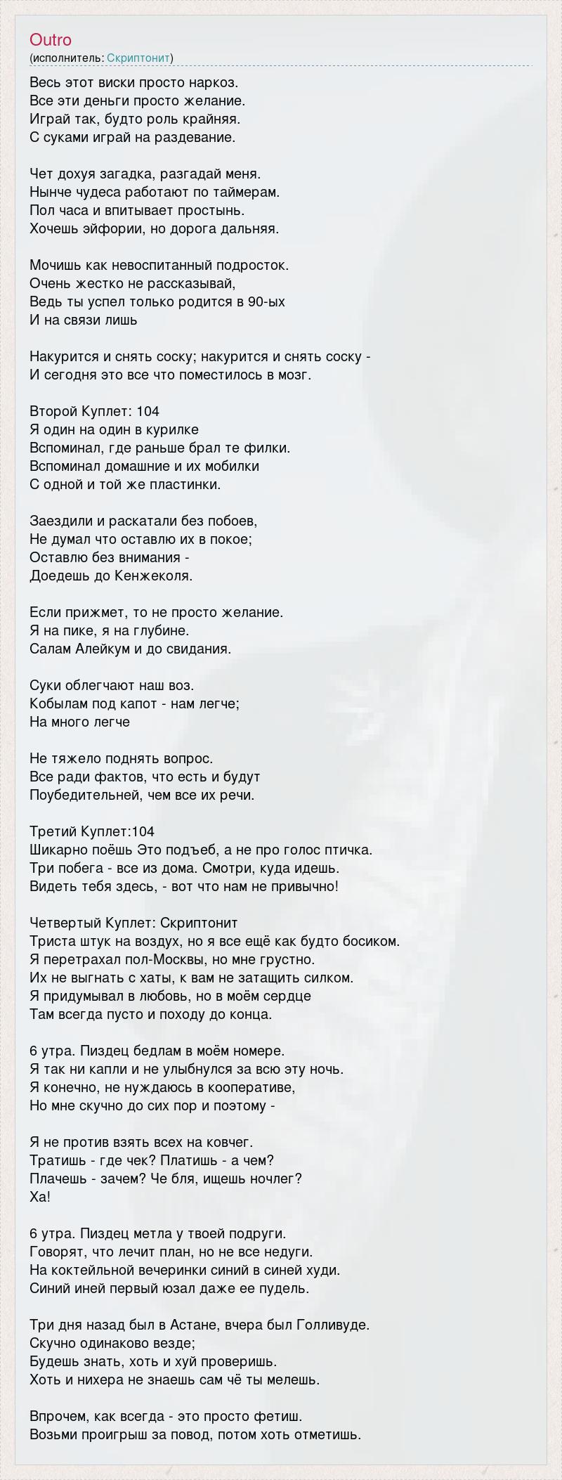 Весь этот виски просто наркоз. Все эти деньги просто желание. Играй так, будто роль крайняя. С суками играй на раздевание. Чет дохуя загадка, разгадай меня. Нынче чудеса работают по таймерам. Пол часа и впитывает простынь. Хочешь эйфории, но дорога дальняя. Мочишь как невоспитанный подросток. Очень жестко не рассказывай, Ведь ты успел только родится в 90-ых И на связи лишь Накурится и снять соску; накурится и снять соску - И сегодня это все что поместилось в мозг. Второй Куплет: 104 Я один на один в курилке Вспоминал, где раньше брал те филки. Вспоминал домашние и их мобилки С одной и той же пластинки. Заездили и раскатали без побоев, Не думал что оставлю их в покое; Оставлю без внимания - Доедешь до Кенжеколя. Если прижмет, то не просто желание. Я на пике, я на глубине. Салам Алейкум и до свидания. Суки облегчают наш воз. Кобылам под капот - нам легче; На много легче Не тяжело поднять вопрос. Все ради фактов, что есть и будут Поубедительней, чем все их речи. Третий Куплет:104 Шикарно поёшь Это подъеб, а не про голос птичка. Три побега - все из дома. Смотри, куда идешь. Видеть тебя здесь, - вот что нам не привычно! Четвертый Куплет: Скриптонит Триста штук на воздух, но я все ещё как будто босиком. Я перетрахал пол-Москвы, но мне грустно. Их не выгнать с хаты, к вам не затащить силком. Я придумывал в любовь, но в моём сердце Там всегда пусто и походу до конца. 6 утра. Пиздец бедлам в моём номере. Я так ни капли и не улыбнулся за всю эту ночь. Я конечно, не нуждаюсь в кооперативе, Но мне скучно до сих пор и поэтому - Я не против взять всех на ковчег. Тратишь - где чек? Платишь - а чем? Плачешь - зачем? Че бля, ищешь ночлег? Ха! 6 утра. Пиздец метла у твоей подруги. Говорят, что лечит план, но не все недуги. На коктейльной вечеринки синий в синей худи. Синий иней первый юзал даже ее пудель. Три дня назад был в Астане, вчера был Голливуде. Скучно одинаково везде; Будешь знать, хоть и хуй проверишь. Хоть и нихера не знаешь сам чё ты мелешь. Впрочем, как всегда - это просто фетиш. Возьми проигрыш за повод, потом хоть отметишь.