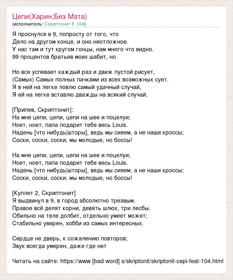 Я проснулся в 9, попросту от того, что Дело на другом конце, и оно неотложное. У нас там и тут кругом гонцы, нам много что видно. 99 процентов братьев моих шабит, но Но все успевает каждый раз и движ пустой рисует, (Самых) Самых полных пачками из всех возможных сует. Я в ней на легке ловлю самый удачный случай, Я ей на легке вставлю дважды на всякий случай. [Припев, Скриптонит]: На мне цепи, цепи, цепи на шее и поцелуи; Ноет, ноет, папа подарит тебе весь Louis. Надень [что нибудь|шторы], ведь мы сияем, а не наши кроссы; Соски, соски, соски, мы молодые, но боссы! На мне цепи, цепи, цепи на шее и поцелуи; Ноет, ноет, папа подарит тебе весь Louis. Надень [что нибудь|шторы], ведь мы сияем, а не наши кроссы; Соски, соски, соски, мы молодые, но боссы! [Куплет 2, Скриптонит] Я выдвинул в 9, в город абсолютно трезвым. Правое всё делят корни, девять шлюх, три лесбы. Обильно на теле долбит, отдельно умеет может; Стабильно уверен, хобби из самых интересных. Сердце не дверь, к сожалению повторов; Звук всегда умерен, даже где нет Читать на сайте: https://www [bad word] s/skriptonit/skriptonit-cepi-feat-104.html
