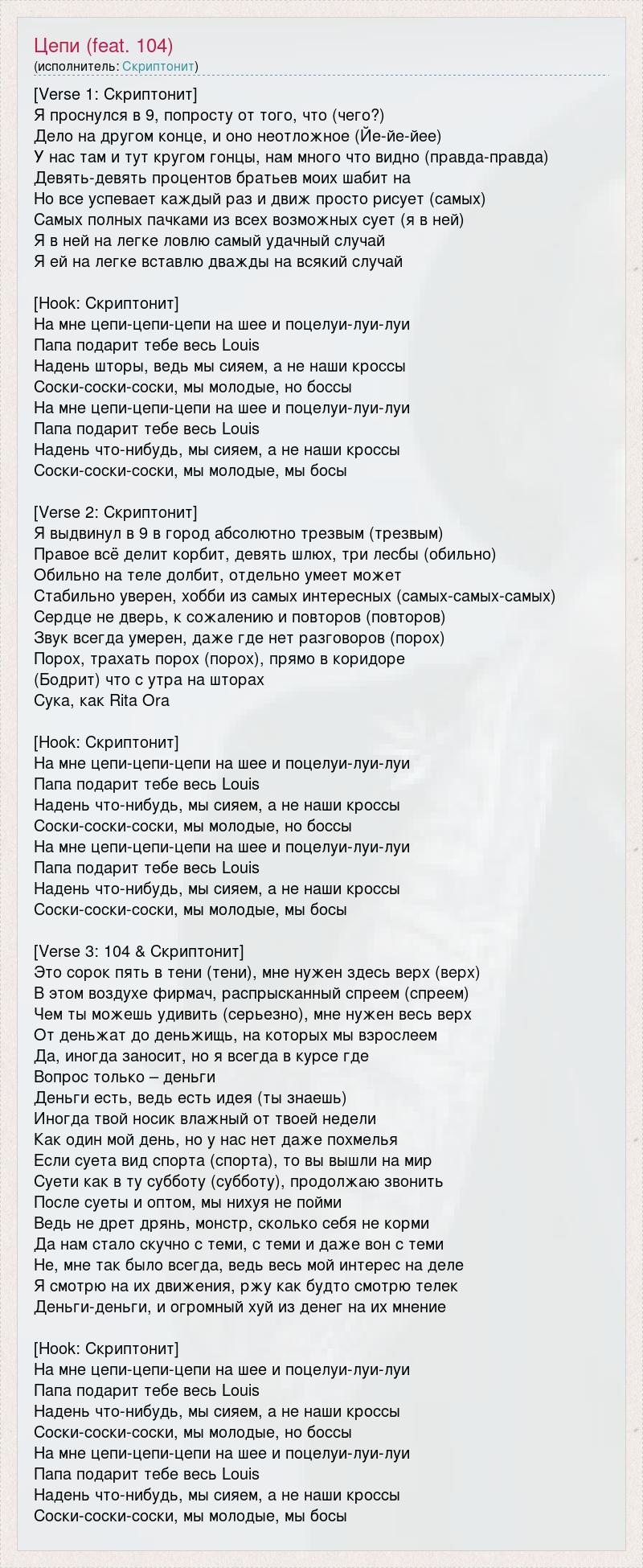 [Verse 1: Скриптонит] Я проснулся в 9, попросту от того, что (чего?) Дело на другом конце, и оно неотложное (Йе-йе-йее) У нас там и тут кругом гонцы, нам много что видно (правда-правда) Девять-девять процентов братьев моих шабит на Но все успевает каждый раз и движ просто рисует (самых) Самых полных пачками из всех возможных сует (я в ней) Я в ней на легке ловлю самый удачный случай Я ей на легке вставлю дважды на всякий случай [Hook: Скриптонит] На мне цепи-цепи-цепи на шее и поцелуи-луи-луи Папа подарит тебе весь Louis Надень шторы, ведь мы сияем, а не наши кроссы Соски-соски-соски, мы молодые, но боссы На мне цепи-цепи-цепи на шее и поцелуи-луи-луи Папа подарит тебе весь Louis Надень что-нибудь, мы сияем, а не наши кроссы Соски-соски-соски, мы молодые, мы босы [Verse 2: Скриптонит] Я выдвинул в 9 в город абсолютно трезвым (трезвым) Правое всё делит корбит, девять шлюх, три лесбы (обильно) Обильно на теле долбит, отдельно умеет может Стабильно уверен, хобби из самых интересных (самых-самых-самых) Сердце не дверь, к сожалению и повторов (повторов) Звук всегда умерен, даже где нет разговоров (порох) Порох, трахать порох (порох), прямо в коридоре (Бодрит) что с утра на шторах Сука, как Rita Ora [Hook: Скриптонит] На мне цепи-цепи-цепи на шее и поцелуи-луи-луи Папа подарит тебе весь Louis Надень что-нибудь, мы сияем, а не наши кроссы Соски-соски-соски, мы молодые, но боссы На мне цепи-цепи-цепи на шее и поцелуи-луи-луи Папа подарит тебе весь Louis Надень что-нибудь, мы сияем, а не наши кроссы Соски-соски-соски, мы молодые, мы босы [Verse 3: 104 & Скриптонит] Это сорок пять в тени (тени), мне нужен здесь верх (верх) В этом воздухе фирмач, распрысканный спреем (спреем) Чем ты можешь удивить (серьезно), мне нужен весь верх От деньжат до деньжищь, на которых мы взрослеем Да, иногда заносит, но я всегда в курсе где Вопрос только – деньги Деньги есть, ведь есть идея (ты знаешь) Иногда твой носик влажный от твоей недели Как один мой день, но у нас нет даже похмелья Если суета вид спорта (спорта), то вы вышли на мир Суети как в ту субботу (субботу), продолжаю звонить После суеты и оптом, мы нихуя не пойми Ведь не дрет дрянь, монстр, сколько себя не корми Да нам стало скучно с теми, с теми и даже вон с теми Не, мне так было всегда, ведь весь мой интерес на деле Я смотрю на их движения, ржу как будто смотрю телек Деньги-деньги, и огромный хуй из денег на их мнение [Hook: Скриптонит] На мне цепи-цепи-цепи на шее и поцелуи-луи-луи Папа подарит тебе весь Louis Надень что-нибудь, мы сияем, а не наши кроссы Соски-соски-соски, мы молодые, но боссы На мне цепи-цепи-цепи на шее и поцелуи-луи-луи Папа подарит тебе весь Louis Надень что-нибудь, мы сияем, а не наши кроссы Соски-соски-соски, мы молодые, мы босы
