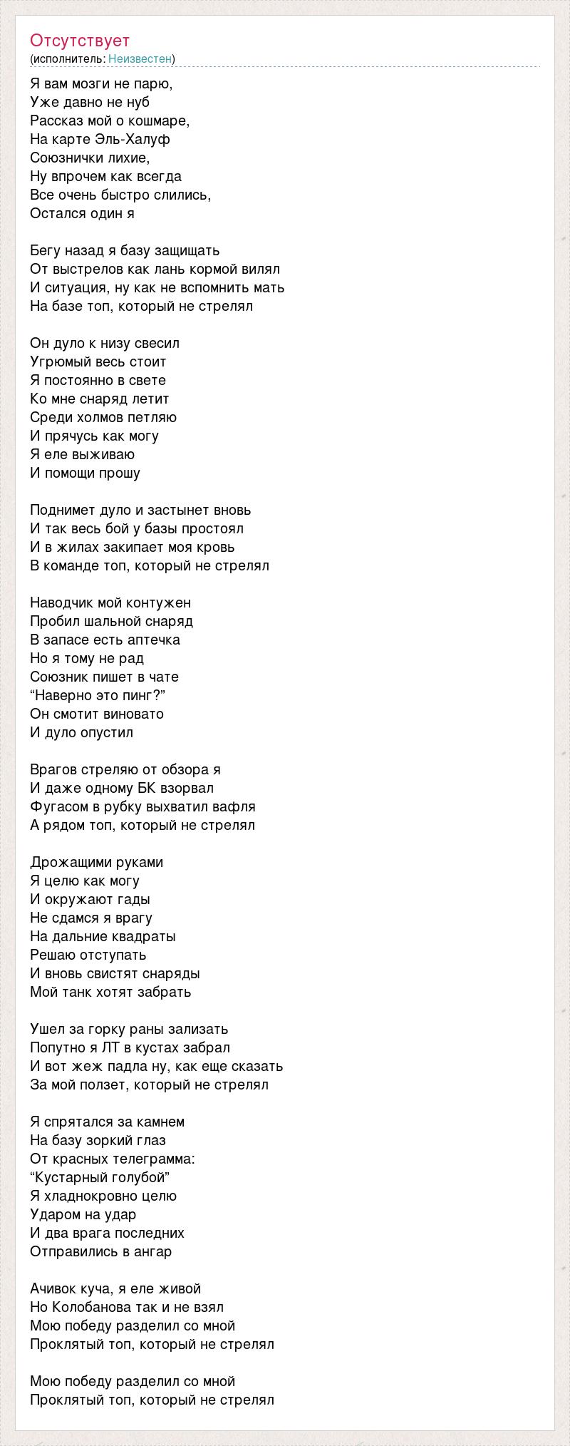 Я вам мозги не парю, Уже давно не нуб Рассказ мой о кошмаре, На карте Эль-Халуф Союзнички лихие, Ну впрочем как всегда Все очень быстро слились, Остался один я Бегу назад я базу защищать От выстрелов как лань кормой вилял И ситуация, ну как не вспомнить мать На базе топ, который не стрелял Он дуло к низу свесил Угрюмый весь стоит Я постоянно в свете Ко мне снаряд летит Среди холмов петляю И прячусь как могу Я еле выживаю И помощи прошу Поднимет дуло и застынет вновь И так весь бой у базы простоял И в жилах закипает моя кровь В команде топ, который не стрелял Наводчик мой контужен Пробил шальной снаряд В запасе есть аптечка Но я тому не рад Союзник пишет в чате “Наверно это пинг?” Он смотит виновато И дуло опустил Врагов стреляю от обзора я И даже одному БК взорвал Фугасом в рубку выхватил вафля А рядом топ, который не стрелял Дрожащими руками Я целю как могу И окружают гады Не сдамся я врагу На дальние квадраты Решаю отступать И вновь свистят снаряды Мой танк хотят забрать Ушел за горку раны зализать Попутно я ЛТ в кустах забрал И вот жеж падла ну, как еще сказать За мой ползет, который не стрелял Я спрятался за камнем На базу зоркий глаз От красных телеграмма: “Кустарный голубой” Я хладнокровно целю Ударом на удар И два врага последних Отправились в ангар Ачивок куча, я еле живой Но Колобанова так и не взял Мою победу разделил со мной Проклятый топ, который не стрелял Мою победу разделил со мной Проклятый топ, который не стрелял