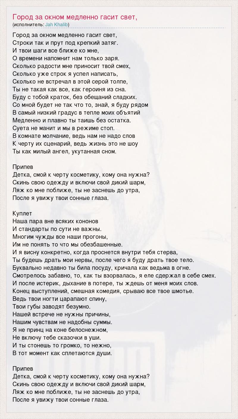 Город за окном медленно гасит свет, Строки так и прут под крепкий затяг. И твои шаги все ближе ко мне, О времени напомнит нам только заря. Сколько радости мне приносит твой смех, Сколько уже строк я успел написать, Сколько не встречал в этой серой толпе, Ты не такая как все, как героиня из сна. Буду с тобой краток, без обещаний сладких. Со мной будет не так что то, знай, я буду рядом В самый низкий градус в тепле моих объятий Медленно и плавно ты таишь без остатка. Суета не манит и мы в режиме стоп. В комнате молчание, ведь нам не надо слов К черту их сценарий, ведь жизнь это не шоу Ты как милый ангел, укутанная сном. Припев Детка, смой к черту косметику, кому она нужна? Скинь свою одежду и включи свой дикий шарм, Ляж ко мне поближе, ты не заснешь до утра, После я увижу твои сонные глаза. Куплет Наша пара вне всяких кононов И стандарты по сути не важны. Многим чужды все наши прогоны, Им не понять то что мы обезбашенные. И я висну конкретно, когда проснется внутри тебя стерва, Ты будешь драть мои нервы, после чего я буду драть твое тело. Буквально недавно ты била посуду, кричала как ведьма в огне. Смотрелось забавно, то, как ты взорвалась, я еле сдержал в себе смех. И после истерик, дыхание в потере, ты ждешь от меня моих слов. Конец выступлений, смешная комедия, срываю все твое шмотье. Ведь твои ногти царапают спину, Твои губы заводят безумно. Нашей встрече не нужны причины, Нашим чувствам не надобны суммы. Я не принц на коне белоснежном, Не включу тебе сказочки в уши. И ты стонешь то громко, то нежно, В тот момент как сплетаются души. Припев Детка, смой к черту косметику, кому она нужна? Скинь свою одежду и включи свой дикий шарм, Ляж ко мне поближе, ты не заснешь до утра, После я увижу твои сонные глаза.