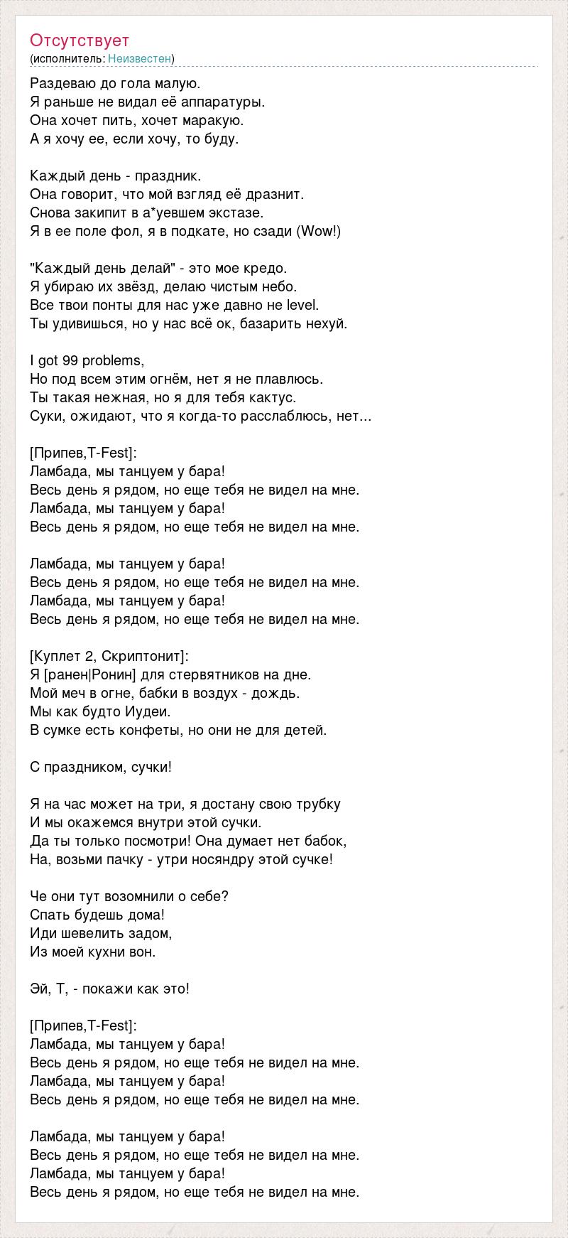 Раздеваю до гола малую. Я раньше не видал её аппаратуры. Она хочет пить, хочет маракую. А я хочу ее, если хочу, то буду. Каждый день - праздник. Она говорит, что мой взгляд её дразнит. Снова закипит в а*уевшем экстазе. Я в ее поле фол, я в подкате, но сзади (Wow!) "Каждый день делай" - это мое кредо. Я убираю их звёзд, делаю чистым небо. Все твои понты для нас уже давно не level. Ты удивишься, но у нас всё ок, базарить нехуй. I got 99 problems, Но под всем этим огнём, нет я не плавлюсь. Ты такая нежная, но я для тебя кактус. Суки, ожидают, что я когда-то расслаблюсь, нет... [Припев,T-Fest]: Ламбада, мы танцуем у бара! Весь день я рядом, но еще тебя не видел на мне. Ламбада, мы танцуем у бара! Весь день я рядом, но еще тебя не видел на мне. Ламбада, мы танцуем у бара! Весь день я рядом, но еще тебя не видел на мне. Ламбада, мы танцуем у бара! Весь день я рядом, но еще тебя не видел на мне. [Куплет 2, Скриптонит]: Я [ранен|Ронин] для стервятников на дне. Мой меч в огне, бабки в воздух - дождь. Мы как будто Иудеи. В сумке есть конфеты, но они не для детей. С праздником, сучки! Я на час может на три, я достану свою трубку И мы окажемся внутри этой сучки. Да ты только посмотри! Она думает нет бабок, На, возьми пачку - утри носяндру этой сучке! Че они тут возомнили о себе? Спать будешь дома! Иди шевелить задом, Из моей кухни вон. Эй, Т, - покажи как это! [Припев,T-Fest]: Ламбада, мы танцуем у бара! Весь день я рядом, но еще тебя не видел на мне. Ламбада, мы танцуем у бара! Весь день я рядом, но еще тебя не видел на мне. Ламбада, мы танцуем у бара! Весь день я рядом, но еще тебя не видел на мне. Ламбада, мы танцуем у бара! Весь день я рядом, но еще тебя не видел на мне.