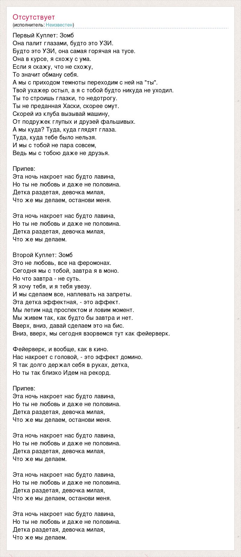 Первый Куплет: Зомб Она палит глазами, будто это УЗИ. Будто это УЗИ, она самая горячая на тусе. Она в курсе, я схожу с ума. Если я скажу, что не схожу, То значит обману себя. А мы с приходом темноты переходим с ней на "ты". Твой ухажер остыл, а я с тобой будто никуда не уходил. Ты то строишь глазки, то недотрогу. Ты не преданная Хаски, скорее омут. Скорей из клуба вызывай машину, От подружек глупых и друзей фальшивых. А мы куда? Туда, куда глядят глаза. Туда, куда тебе было нельзя. И мы с тобой не пара совсем, Ведь мы с тобою даже не друзья. Припев: Эта ночь накроет нас будто лавина, Но ты не любовь и даже не половина. Детка раздетая, девочка милая, Что же мы делаем, останови меня. Эта ночь накроет нас будто лавина, Но ты не любовь и даже не половина. Детка раздетая, девочка милая, Что же мы делаем. Второй Куплет: Зомб Это не любовь, все на феромонах. Сегодня мы с тобой, завтра я в моно. Но что завтра - не суть. Я хочу тебя, и я тебя увезу. И мы сделаем все, наплевать на запреты. Эта детка эффектная, - это аффект. Мы летим над проспектом и ловим момент. Мы живем так, как будто бы завтра и нет. Вверх, вниз, давай сделаем это на бис. Вниз, вверх, мы сегодня взорвемся тут как фейерверк. Фейерверк, и вообще, как в кино. Нас накроет с головой, - это эффект домино. Я так долго держал себя в руках, детка, Но ты так близко Идем на рекорд. Припев: Эта ночь накроет нас будто лавина, Но ты не любовь и даже не половина. Детка раздетая, девочка милая, Что же мы делаем, останови меня. Эта ночь накроет нас будто лавина, Но ты не любовь и даже не половина. Детка раздетая, девочка милая, Что же мы делаем. Эта ночь накроет нас будто лавина, Но ты не любовь и даже не половина. Детка раздетая, девочка милая, Что же мы делаем, останови меня. Эта ночь накроет нас будто лавина, Но ты не любовь и даже не половина. Детка раздетая, девочка милая, Что же мы делаем.