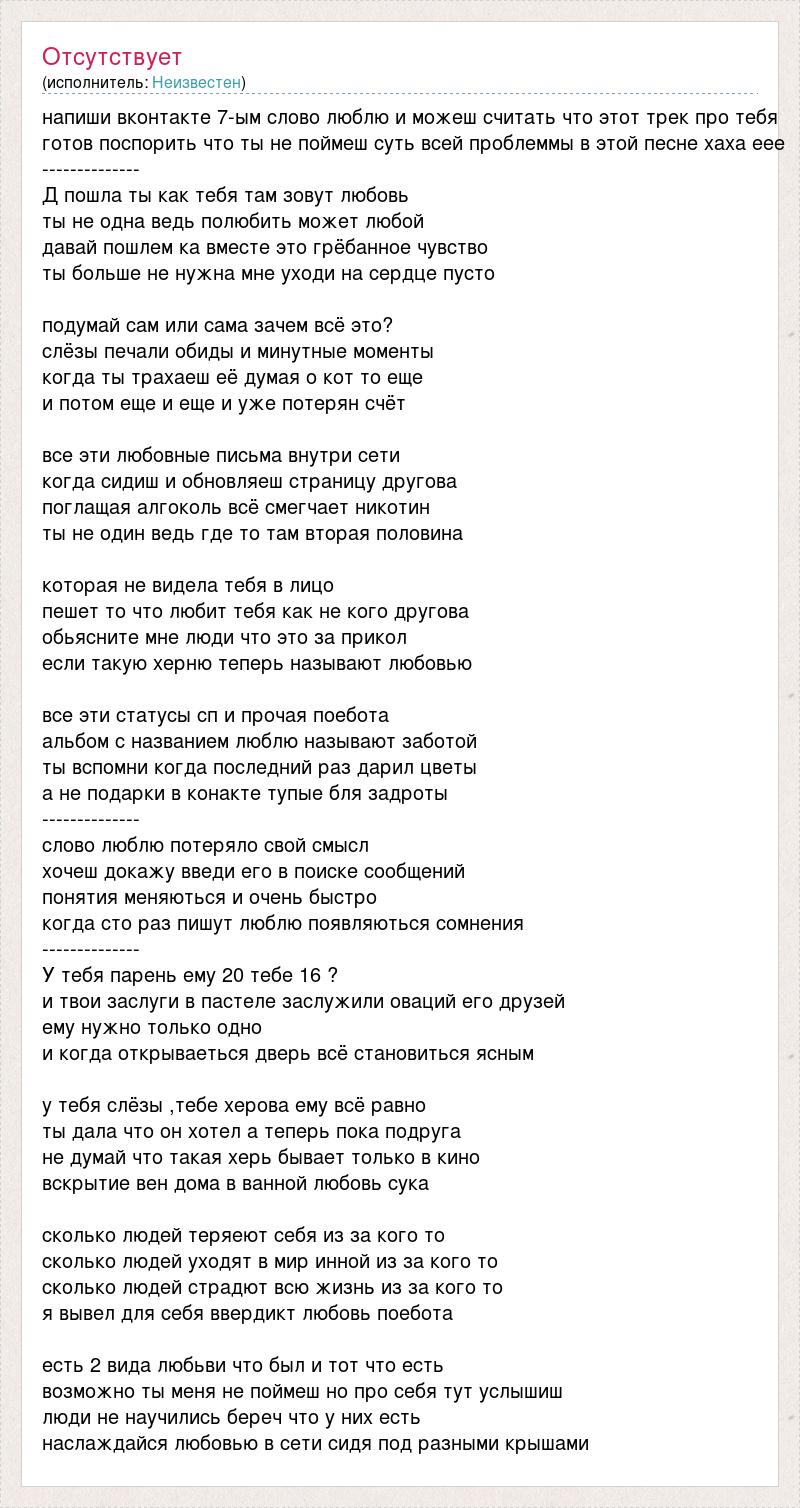 напиши вконтакте 7-ым слово люблю и можеш считать что этот трек про тебя готов поспорить что ты не поймеш суть всей проблеммы в этой песне хаха еее -------------- Д пошла ты как тебя там зовут любовь ты не одна ведь полюбить может любой давай пошлем ка вместе это грёбанное чувство ты больше не нужна мне уходи на сердце пусто подумай сам или сама зачем всё это? слёзы печали обиды и минутные моменты когда ты трахаеш её думая о кот то еще и потом еще и еще и уже потерян счёт все эти любовные письма внутри сети когда сидиш и обновляеш страницу другова поглащая алгоколь всё смегчает никотин ты не один ведь где то там вторая половина которая не видела тебя в лицо пешет то что любит тебя как не кого другова обьясните мне люди что это за прикол если такую херню теперь называют любовью все эти статусы сп и прочая поебота альбом с названием люблю называют заботой ты вспомни когда последний раз дарил цветы а не подарки в конакте тупые бля задроты -------------- слово люблю потеряло свой смысл хочеш докажу введи его в поиске сообщений понятия меняються и очень быстро когда сто раз пишут люблю появляються сомнения -------------- У тебя парень ему 20 тебе 16 ? и твои заслуги в пастеле заслужили оваций его друзей ему нужно только одно и когда открываеться дверь всё становиться ясным у тебя слёзы ,тебе херова ему всё равно ты дала что он хотел а теперь пока подруга не думай что такая херь бывает только в кино вскрытие вен дома в ванной любовь сука сколько людей теряеют себя из за кого то сколько людей уходят в мир инной из за кого то сколько людей страдют всю жизнь из за кого то я вывел для себя ввердикт любовь поебота есть 2 вида любьви что был и тот что есть возможно ты меня не поймеш но про себя тут услышиш люди не научились береч что у них есть наслаждайся любовью в сети сидя под разными крышами