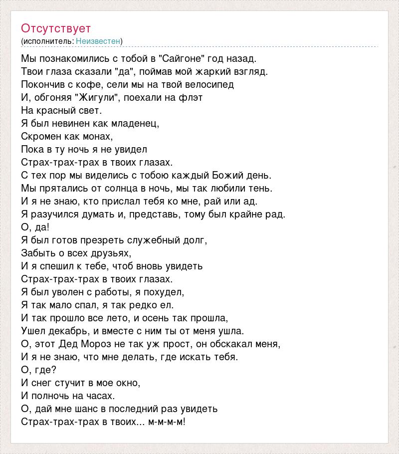 Мы познакомились с тобой в "Сайгоне" год назад. Твои глаза сказали "да", поймав мой жаркий взгляд. Покончив с кофе, сели мы на твой велосипед И, обгоняя "Жигули", поехали на флэт На красный свет. Я был невинен как младенец, Скромен как монах, Пока в ту ночь я не увидел Страх-трах-трах в твоих глазах. С тех пор мы виделись с тобою каждый Божий день. Мы прятались от солнца в ночь, мы так любили тень. И я не знаю, кто прислал тебя ко мне, рай или ад. Я разучился думать и, представь, тому был крайне рад. О, да! Я был готов презреть служебный долг, Забыть о всех друзьях, И я спешил к тебе, чтоб вновь увидеть Страх-трах-трах в твоих глазах. Я был уволен с работы, я похудел, Я так мало спал, я так редко ел. И так прошло все лето, и осень так прошла, Ушел декабрь, и вместе с ним ты от меня ушла. О, этот Дед Мороз не так уж прост, он обскакал меня, И я не знаю, что мне делать, где искать тебя. О, где? И снег стучит в мое окно, И полночь на часах. О, дай мне шанс в последний раз увидеть Страх-трах-трах в твоих... м-м-м-м!