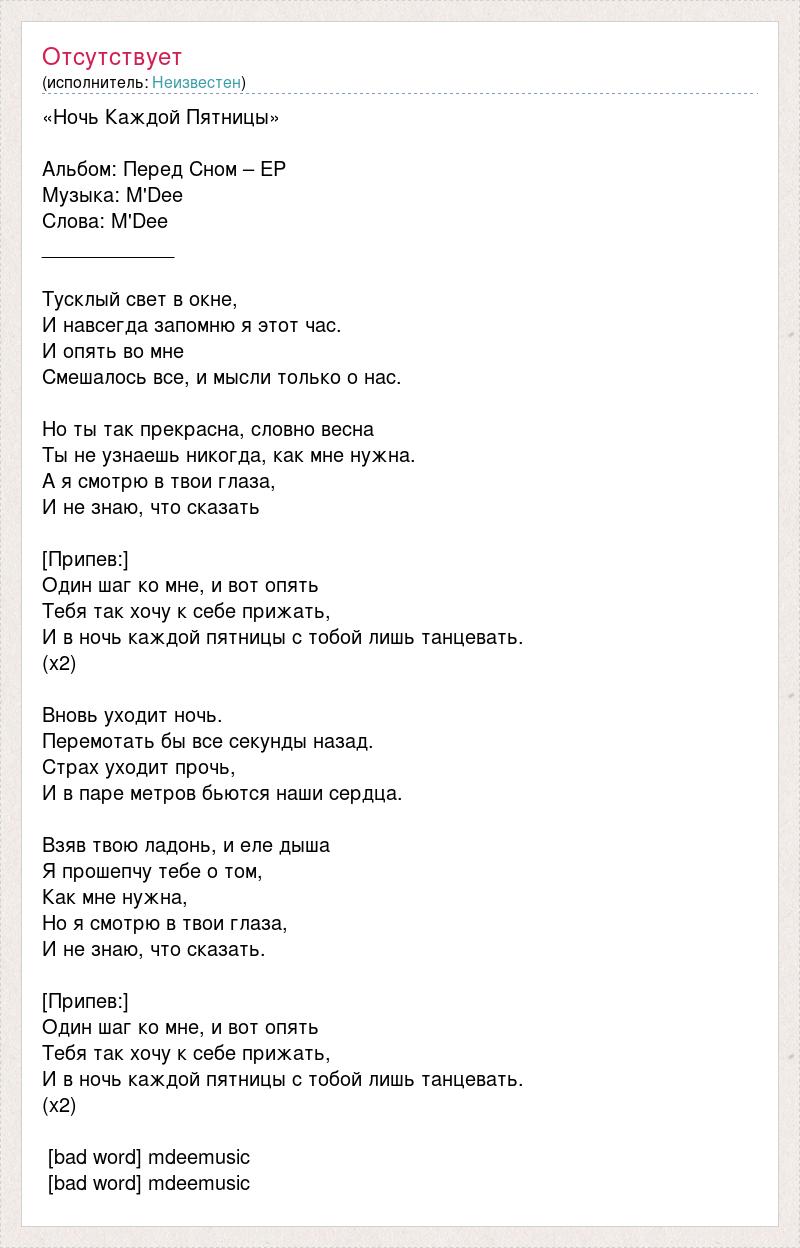 «Ночь Каждой Пятницы» Альбом: Перед Сном – EP Музыка: M'Dee Слова: M'Dee ____________ Тусклый свет в окне, И навсегда запомню я этот час. И опять во мне Смешалось все, и мысли только о нас. Но ты так прекрасна, словно весна Ты не узнаешь никогда, как мне нужна. А я смотрю в твои глаза, И не знаю, что сказать [Припев:] Один шаг ко мне, и вот опять Тебя так хочу к себе прижать, И в ночь каждой пятницы с тобой лишь танцевать. (x2) Вновь уходит ночь. Перемотать бы все секунды назад. Страх уходит прочь, И в паре метров бьются наши сердца. Взяв твою ладонь, и еле дыша Я прошепчу тебе о том, Как мне нужна, Но я смотрю в твои глаза, И не знаю, что сказать. [Припев:] Один шаг ко мне, и вот опять Тебя так хочу к себе прижать, И в ночь каждой пятницы с тобой лишь танцевать. (x2) [bad word] mdeemusic [bad word] mdeemusic
