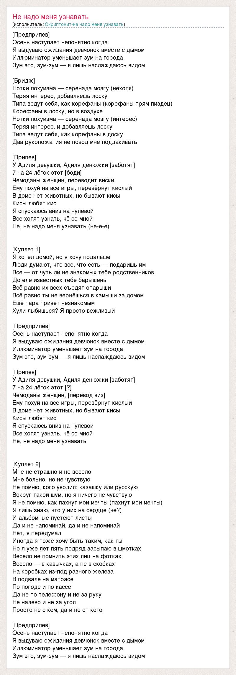 [Предприпев] Осень наступает непонятно когда Я выдуваю ожидания девчонок вместе с дымом Иллюминатор уменьшает зум на города Зум это, зум-зум — я лишь наслаждаюсь видом [Бридж] Нотки похуизма — серенада мозгу (нехотя) Теряя интерес, добавляешь лоску Типа ведут себя, как корефаны (корефаны прям пиздец) Корефаны в доску, но в воздухе Нотки похуизма — серенада мозгу (интерес) Теряя интерес, и добавляешь лоску Типа ведут себя, как корефаны в доску Два рукопожатия не повод мне поддакивать [Припев] У Адиля девушки, Адиля денюжки [заботят] 7 на 24 лёгок этот [боди] Чемоданы женщин, переводит виски Ему похуй на все игры, перевёрнут кислый В доме нет животных, но бывают кисы Кисы любят кис Я спускаюсь вниз на нулевой Все хотят узнать, чё со мной Не, не надо меня узнавать (не-е-е) [Куплет 1] Я хотел домой, но я хочу подальше Люди думают, что все, что есть — подаришь им Все — от чуть ли не знакомых тебе родственников До еле известных тебе барышень Всё равно их всех съедят опарыши Всё равно ты не вернёшься в камыши за домом Ещё пара привет незнакомым Хули лыбишься? Я просто вежливый [Предприпев] Осень наступает непонятно когда Я выдуваю ожидания девчонок вместе с дымом Иллюминатор уменьшает зум на города Зум это, зум-зум — я лишь наслаждаюсь видом [Припев] У Адиля девушки, Адиля денюжки [заботят] 7 на 24 лёгок этот [?] Чемоданы женщин, [перевод виз] Ему похуй на все игры, перевёрнут кислый В доме нет животных, но бывают кисы Кисы любят кис Я спускаюсь вниз на нулевой Все хотят узнать, чё со мной Не, не надо меня узнавать [Куплет 2] Мне не страшно и не весело Мне больно, но не чувствую Не помню, кого уводил: казашку или русскую Вокруг такой шум, но я ничего не чувствую Я не помню, как пахнут мои мечты (пахнут мои мечты) Я лишь знаю, что у них на сердце (чё?) И альбомные пустеют листы Да и не напоминай, да и не напоминай Нет, я передумал Иногда я тоже хочу быть таким, как ты Но я уже лет пять подряд засыпаю в шмотках Весело не помнить этих лиц на фотках Весело — в кавычках, а не в скобках На коробках из-под разного железа В подвале на матрасе По погоде и по кассе Да не по телефону и не за руку Не налево и не за угол Просто не с кем, да и не от кого [Предприпев] Осень наступает непонятно когда Я выдуваю ожидания девчонок вместе с дымом Иллюминатор уменьшает зум на города Зум это, зум-зум — я лишь наслаждаюсь видом