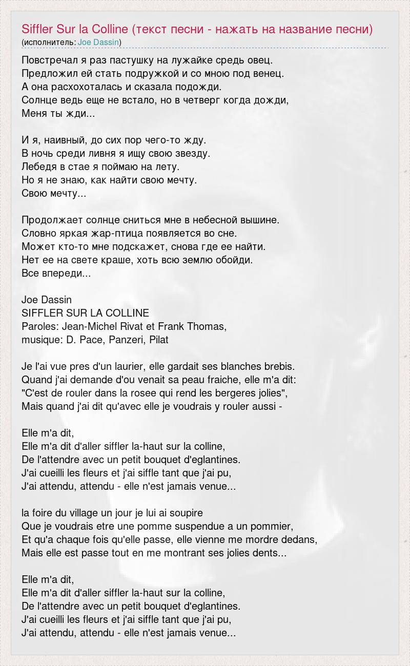 Повстречал я раз пастушку на лужайке средь овец. Предложил ей стать подружкой и со мною под венец. А она расхохоталась и сказала подожди. Солнце ведь еще не встало, но в четверг когда дожди, Меня ты жди... И я, наивный, до сих пор чего-то жду. В ночь среди ливня я ищу свою звезду. Лебедя в стае я поймаю на лету. Но я не знаю, как найти свою мечту. Свою мечту... Продолжает солнце сниться мне в небесной вышине. Словно яркая жар-птица появляется во сне. Может кто-то мне подскажет, снова где ее найти. Нет ее на свете краше, хоть всю землю обойди. Все впереди... Joe Dassin SIFFLER SUR LA COLLINE Paroles: Jean-Michel Rivat et Frank Thomas, musique: D. Pace, Panzeri, Pilat Je l'ai vue pres d'un laurier, elle gardait ses blanches brebis. Quand j'ai demande d'ou venait sa peau fraiche, elle m'a dit: "C'est de rouler dans la rosee qui rend les bergeres jolies", Mais quand j'ai dit qu'avec elle je voudrais y rouler aussi - Elle m'a dit, Elle m'a dit d'aller siffler la-haut sur la colline, De l'attendre avec un petit bouquet d'eglantines. J'ai cueilli les fleurs et j'ai siffle tant que j'ai pu, J'ai attendu, attendu - elle n'est jamais venue... la foire du village un jour je lui ai soupire Que je voudrais etre une pomme suspendue a un pommier, Et qu'a chaque fois qu'elle passe, elle vienne me mordre dedans, Mais elle est passe tout en me montrant ses jolies dents... Elle m'a dit, Elle m'a dit d'aller siffler la-haut sur la colline, De l'attendre avec un petit bouquet d'eglantines. J'ai cueilli les fleurs et j'ai siffle tant que j'ai pu, J'ai attendu, attendu - elle n'est jamais venue...