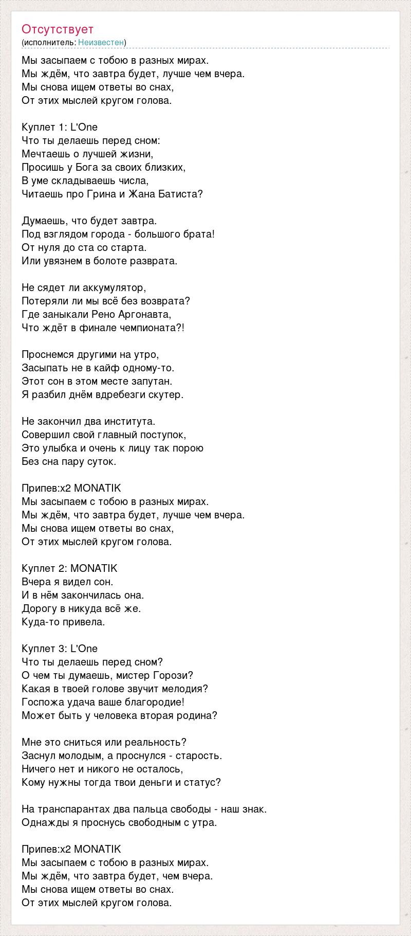 Мы засыпаем с тобою в разных мирах. Мы ждём, что завтра будет, лучше чем вчера. Мы снова ищем ответы во снах, От этих мыслей кругом голова. Куплет 1: L'One Что ты делаешь перед сном: Мечтаешь о лучшей жизни, Просишь у Бога за своих близких, В уме складываешь числа, Читаешь про Грина и Жана Батиста? Думаешь, что будет завтра. Под взглядом города - большого брата! От нуля до ста со старта. Или увязнем в болоте разврата. Не сядет ли аккумулятор, Потеряли ли мы всё без возврата? Где заныкали Рено Аргонавта, Что ждёт в финале чемпионата?! Проснемся другими на утро, Засыпать не в кайф одному-то. Этот сон в этом месте запутан. Я разбил днём вдребезги скутер. Не закончил два института. Совершил свой главный поступок, Это улыбка и очень к лицу так порою Без сна пару суток. Припев:х2 MONATIK Мы засыпаем с тобою в разных мирах. Мы ждём, что завтра будет, лучше чем вчера. Мы снова ищем ответы во снах, От этих мыслей кругом голова. Куплет 2: MONATIK Вчера я видел сон. И в нём закончилась она. Дорогу в никуда всё же. Куда-то привела. Куплет 3: L'One Что ты делаешь перед сном? О чем ты думаешь, мистер Горози? Какая в твоей голове звучит мелодия? Госпожа удача ваше благородие! Может быть у человека вторая родина? Мне это сниться или реальность? Заснул молодым, а проснулся - старость. Ничего нет и никого не осталось, Кому нужны тогда твои деньги и статус? На транспарантах два пальца свободы - наш знак. Однажды я проснусь свободным с утра. Припев:х2 MONATIK Мы засыпаем с тобою в разных мирах. Мы ждём, что завтра будет, чем вчера. Мы снова ищем ответы во снах. От этих мыслей кругом голова.
