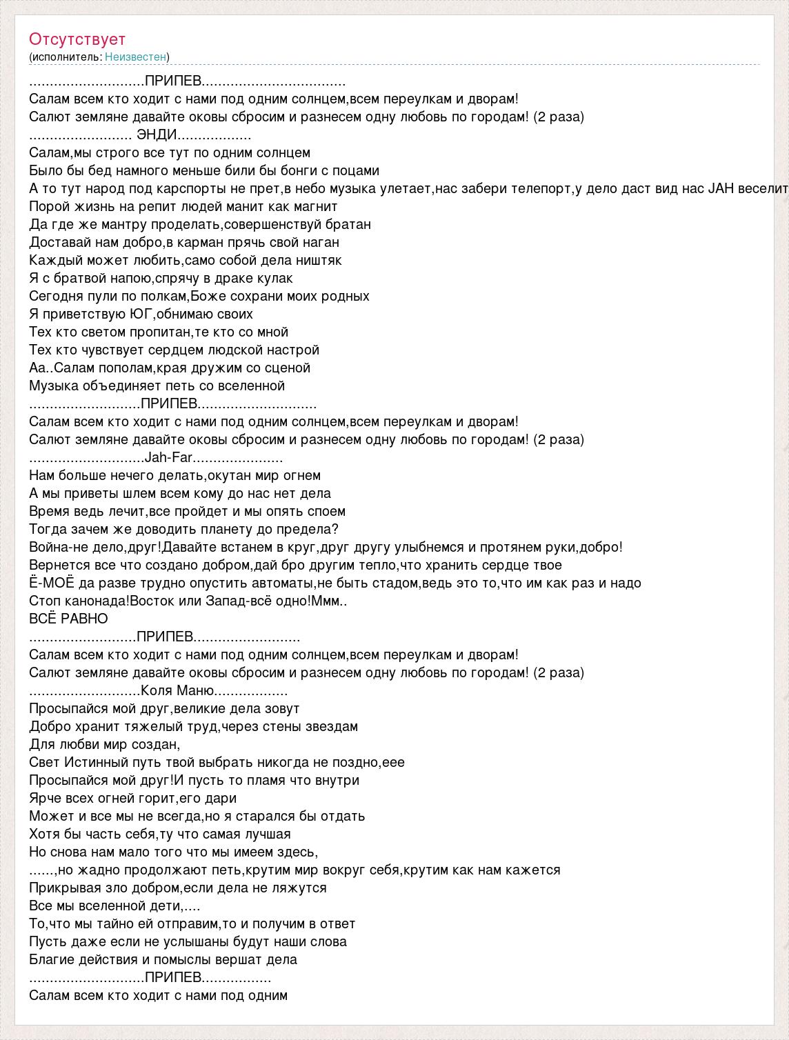 ............................ПРИПЕВ................................... Салам всем кто ходит с нами под одним солнцем,всем переулкам и дворам! Салют земляне давайте оковы сбросим и разнесем одну любовь по городам! (2 раза) ......................... ЭНДИ.................. Салам,мы строго все тут по одним солнцем Было бы бед намного меньше били бы бонги с поцами А то тут народ под карспорты не прет,в небо музыка улетает,нас забери телепорт,у дело даст вид нас JAH веселит Порой жизнь на репит людей манит как магнит Да где же мантру проделать,совершенствуй братан Доставай нам добро,в карман прячь свой наган Каждый может любить,само собой дела ништяк Я с братвой напою,спрячу в драке кулак Сегодня пули по полкам,Боже сохрани моих родных Я приветствую ЮГ,обнимаю своих Тех кто светом пропитан,те кто со мной Тех кто чувствует сердцем людской настрой Аа..Салам пополам,края дружим со сценой Музыка объединяет петь со вселенной ...........................ПРИПЕВ............................. Салам всем кто ходит с нами под одним солнцем,всем переулкам и дворам! Салют земляне давайте оковы сбросим и разнесем одну любовь по городам! (2 раза) ............................Jah-Far...................... Нам больше нечего делать,окутан мир огнем А мы приветы шлем всем кому до нас нет дела Время ведь лечит,все пройдет и мы опять споем Тогда зачем же доводить планету до предела? Война-не дело,друг!Давайте встанем в круг,друг другу улыбнемся и протянем руки,добро! Вернется все что создано добром,дай бро другим тепло,что хранить сердце твое Ё-МОЁ да разве трудно опустить автоматы,не быть стадом,ведь это то,что им как раз и надо Стоп канонада!Восток или Запад-всё одно!Ммм.. ВСЁ РАВНО ..........................ПРИПЕВ.......................... Салам всем кто ходит с нами под одним солнцем,всем переулкам и дворам! Салют земляне давайте оковы сбросим и разнесем одну любовь по городам! (2 раза) ...........................Коля Маню.................. Просыпайся мой друг,великие дела зовут Добро хранит тяжелый труд,через стены звездам Для любви мир создан, Свет Истинный путь твой выбрать никогда не поздно,еее Просыпайся мой друг!И пусть то пламя что внутри Ярче всех огней горит,его дари Может и все мы не всегда,но я старался бы отдать Хотя бы часть себя,ту что самая лучшая Но снова нам мало того что мы имеем здесь, ......,но жадно продолжают петь,крутим мир вокруг себя,крутим как нам кажется Прикрывая зло добром,если дела не ляжутся Все мы вселенной дети,.... То,что мы тайно ей отправим,то и получим в ответ Пусть даже если не услышаны будут наши слова Благие действия и помыслы вершат дела ............................ПРИПЕВ................. Салам всем кто ходит с нами под одним