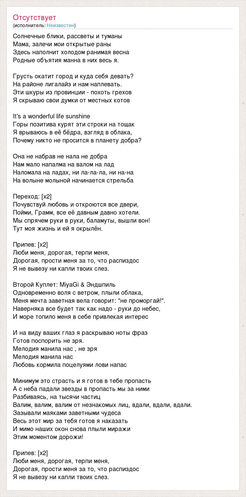 Солнечные блики, рассветы и туманы Мама, залечи мои открытые раны Здесь наполнит холодом ранимая весна Родные объятия манна в них весь я. Грусть окатит город и куда себя девать? На районе лигалайз и нам наплевать. Эти шкуры из провинции - похоть грехов Я скрываю свои думки от местных котов It’s a wonderful life sunshine Горы позитива курят эти строки на тощак Я врываюсь в её бёдра, взгляд в облака, Почему никто не просится в планету добра? Она не набрав не нала не добра Нам мало напалма на валом на лад Наломала на ладах, ни ла-ла-ла, ни на-на На волыне молыной начинается стрельба Переход: [х2] Почувствуй любовь и откроются все двери, Пойми, Грамм, все её давным давно хотели. Мы спрячем руки в руки, баламуты, вышли вон! Тут моя жизнь и ей я окрылён. Припев: [х2] Люби меня, дорогая, терпи меня, Дорогая, прости меня за то, что распиздос Я не вывезу ни капли твоих слез. Второй Куплет: MiyaGi & Эндшпиль Одновременно воля с ветром, плыли облака, Меня мечта заветная вела говорит: "не проморгай!". Наверняка все будет так как надо - руки до небес, И море топило меня в себе привлекая интерес И на виду ваших глаз я раскрываю ноты фраз Готов поспорить не зря. Мелодия манила нас , не зря Мелодия манила нас Любовь кормила поцелуями лови напас Минимум это страсть и я готов в тебе пропасть А с неба падали звезды в пропасть мы за ними Разбиваясь, на тысячи частиц Валим, валим, валим от незнакомых лиц, вдали, вдали, вдали. Зазывали маяками заветными чудеса Весь этот мир за тебя готов я наказать И мимо наших окон снова плыли миражи Этим моментом дорожи! Припев: [х2] Люби меня, дорогая, терпи меня, Дорогая, прости меня за то, что распиздос Я не вывезу ни капли твоих слез.