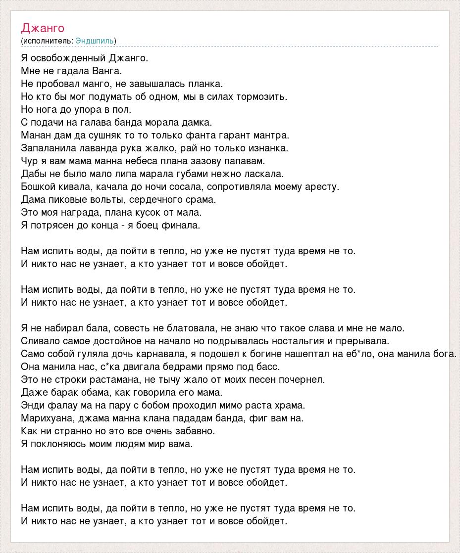 Я освобожденный Джанго. Мне не гадала Ванга. Не пробовал манго, не завышалась планка. Но кто бы мог подумать об одном, мы в силах тормозить. Но нога до упора в пол. С подачи на галава банда морала дамка. Манан дам да сушняк то то только фанта гарант мантра. Запаланила лаванда рука жалко, рай но только изнанка. Чур я вам мама манна небеса плана зазову папавам. Дабы не было мало липа марала губами нежно ласкала. Бошкой кивала, качала до ночи сосала, сопротивляла моему аресту. Дама пиковые вольты, сердечного срама. Это моя награда, плана кусок от мала. Я потрясен до конца - я боец финала. Нам испить воды, да пойти в тепло, но уже не пустят туда время не то. И никто нас не узнает, а кто узнает тот и вовсе обойдет. Нам испить воды, да пойти в тепло, но уже не пустят туда время не то. И никто нас не узнает, а кто узнает тот и вовсе обойдет. Я не набирал бала, совесть не блатовала, не знаю что такое слава и мне не мало. Сливало самое достойное на начало но подрывалась ностальгия и прерывала. Само собой гуляла дочь карнавала, я подошел к богине нашептал на еб*ло, она манила бога. Она манила нас, с*ка двигала бедрами прямо под басс. Это не строки растамана, не тычу жало от моих песен почернел. Даже барак обама, как говорила его мама. Энди фалау ма на пару с бобом проходил мимо раста храма. Марихуана, джама манна клана пададам банда, фиг вам на. Как ни странно но это все очень забавно. Я поклоняюсь моим людям мир вама. Нам испить воды, да пойти в тепло, но уже не пустят туда время не то. И никто нас не узнает, а кто узнает тот и вовсе обойдет. Нам испить воды, да пойти в тепло, но уже не пустят туда время не то. И никто нас не узнает, а кто узнает тот и вовсе обойдет.