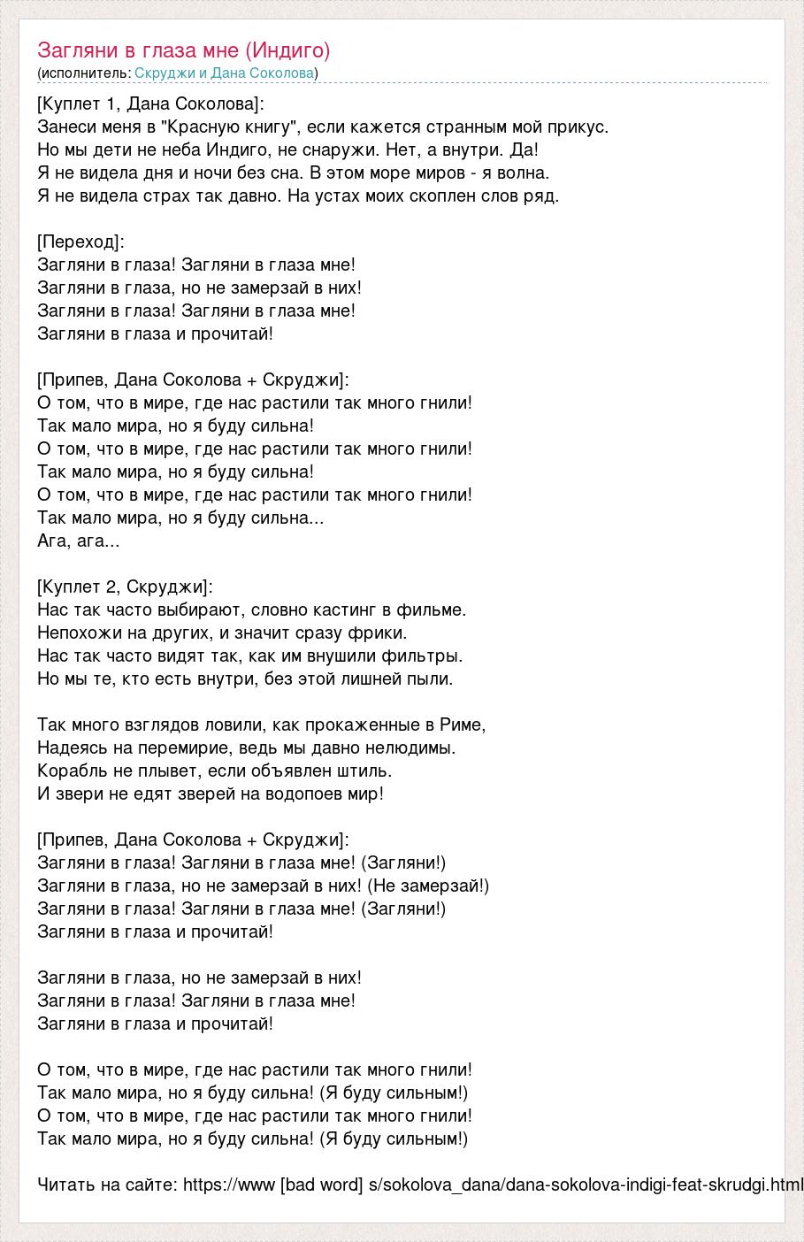 [Куплет 1, Дана Соколова]: Занеси меня в "Красную книгу", если кажется странным мой прикус. Но мы дети не неба Индиго, не снаружи. Нет, а внутри. Да! Я не видела дня и ночи без сна. В этом море миров - я волна. Я не видела страх так давно. На устах моих скоплен слов ряд. [Переход]: Загляни в глаза! Загляни в глаза мне! Загляни в глаза, но не замерзай в них! Загляни в глаза! Загляни в глаза мне! Загляни в глаза и прочитай! [Припев, Дана Соколова + Скруджи]: О том, что в мире, где нас растили так много гнили! Так мало мира, но я буду сильна! О том, что в мире, где нас растили так много гнили! Так мало мира, но я буду сильна! О том, что в мире, где нас растили так много гнили! Так мало мира, но я буду сильна... Ага, ага... [Куплет 2, Скруджи]: Нас так часто выбирают, словно кастинг в фильме. Непохожи на других, и значит сразу фрики. Нас так часто видят так, как им внушили фильтры. Но мы те, кто есть внутри, без этой лишней пыли. Так много взглядов ловили, как прокаженные в Риме, Надеясь на перемирие, ведь мы давно нелюдимы. Корабль не плывет, если объявлен штиль. И звери не едят зверей на водопое в мир! [Припев, Дана Соколова + Скруджи]: Загляни в глаза! Загляни в глаза мне! (Загляни!) Загляни в глаза, но не замерзай в них! (Не замерзай!) Загляни в глаза! Загляни в глаза мне! (Загляни!) Загляни в глаза и прочитай! Загляни в глаза, но не замерзай в них! Загляни в глаза! Загляни в глаза мне! Загляни в глаза и прочитай! О том, что в мире, где нас растили так много гнили! Так мало мира, но я буду сильна! (Я буду сильным!) О том, что в мире, где нас растили так много гнили! Так мало мира, но я буду сильна! (Я буду сильным!) Читать на сайте: https://www [bad word] s/sokolova_dana/dana-sokolova-indigi-feat-skrudgi.html
