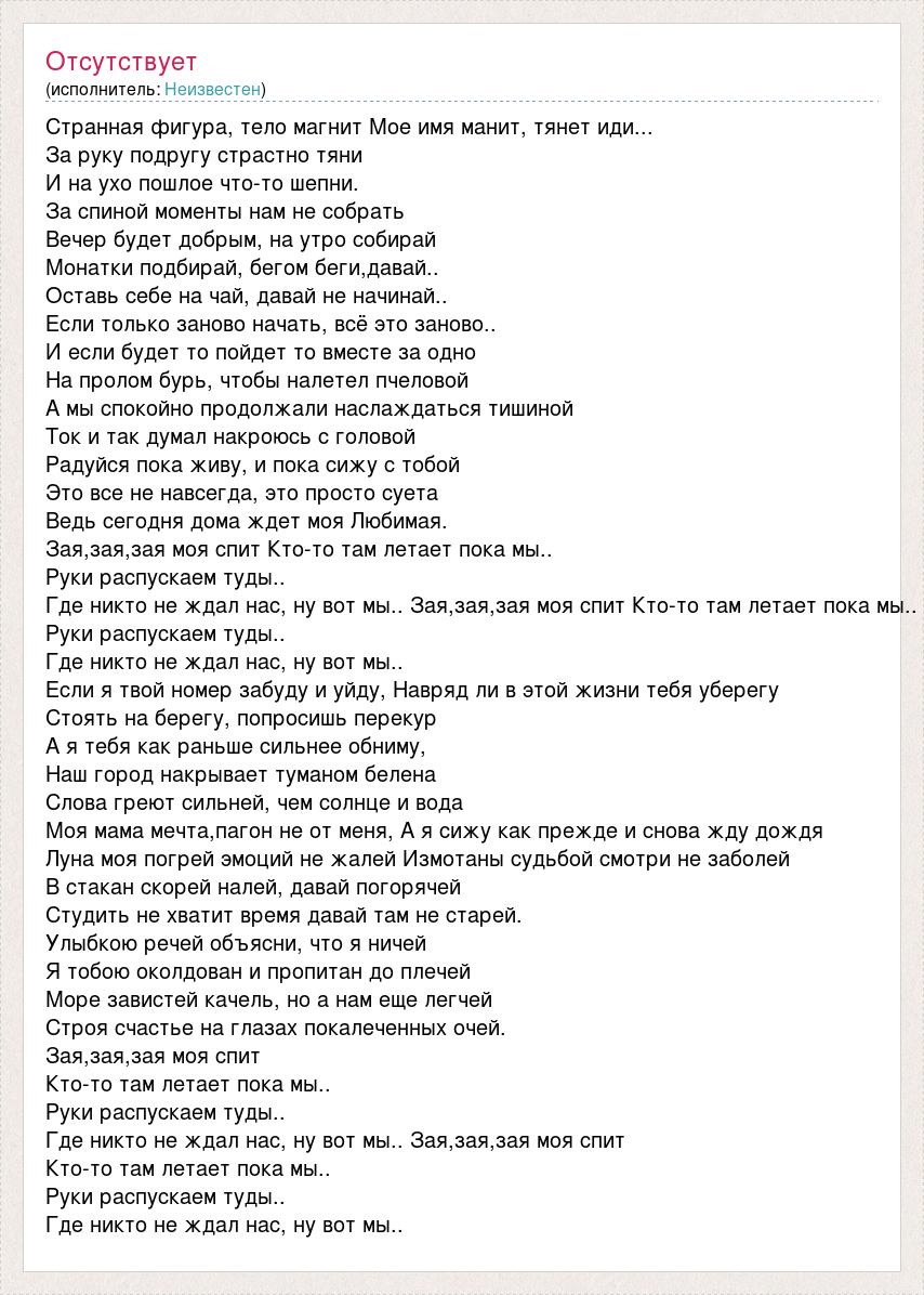 Странная фигура, тело магнит Мое имя манит, тянет иди... За руку подругу страстно тяни И на ухо пошлое что-то шепни. За спиной моменты нам не собрать Вечер будет добрым, на утро собирай Монатки подбирай, бегом беги,давай.. Оставь себе на чай, давай не начинай.. Если только заново начать, всё это заново.. И если будет то пойдет то вместе за одно На пролом бурь, чтобы налетел пчеловой А мы спокойно продолжали наслаждаться тишиной Ток и так думал накроюсь с головой Радуйся пока живу, и пока сижу с тобой Это все не навсегда, это просто суета Ведь сегодня дома ждет моя Любимая. Зая,зая,зая моя спит Кто-то там летает пока мы.. Руки распускаем туды.. Где никто не ждал нас, ну вот мы.. Зая,зая,зая моя спит Кто-то там летает пока мы.. Руки распускаем туды.. Где никто не ждал нас, ну вот мы.. Если я твой номер забуду и уйду, Навряд ли в этой жизни тебя уберегу Стоять на берегу, попросишь перекур А я тебя как раньше сильнее обниму, Наш город накрывает туманом белена Слова греют сильней, чем солнце и вода Моя мама мечта,пагон не от меня, А я сижу как прежде и снова жду дождя Луна моя погрей эмоций не жалей Измотаны судьбой смотри не заболей В стакан скорей налей, давай погорячей Студить не хватит время давай там не старей. Улыбкою речей объясни, что я ничей Я тобою околдован и пропитан до плечей Море завистей качель, но а нам еще легчей Строя счастье на глазах покалеченных очей. Зая,зая,зая моя спит Кто-то там летает пока мы.. Руки распускаем туды.. Где никто не ждал нас, ну вот мы.. Зая,зая,зая моя спит Кто-то там летает пока мы.. Руки распускаем туды.. Где никто не ждал нас, ну вот мы..