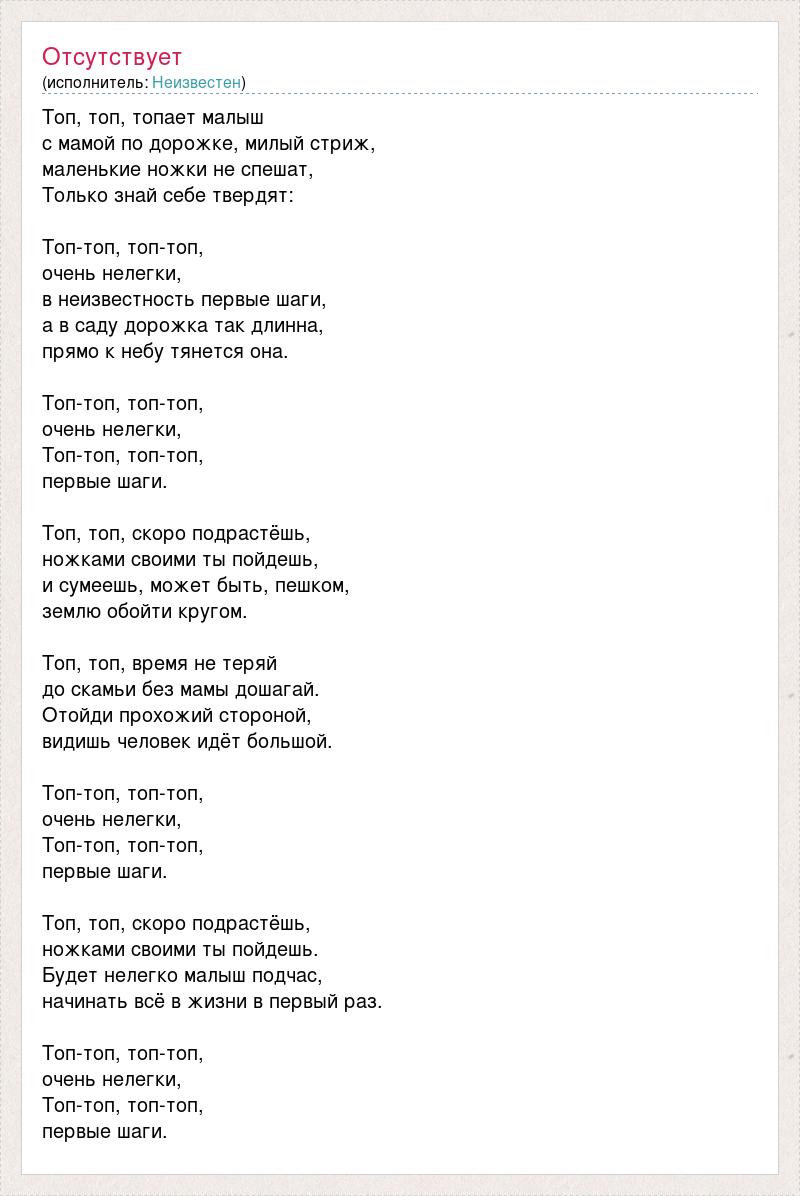 Топ, топ, топает малыш с мамой по дорожке, милый стриж, маленькие ножки не спешат, Только знай себе твердят: Топ-топ, топ-топ, очень нелегки, в неизвестность первые шаги, а в саду дорожка так длинна, прямо к небу тянется она. Топ-топ, топ-топ, очень нелегки, Топ-топ, топ-топ, первые шаги. Топ, топ, скоро подрастёшь, ножками своими ты пойдешь, и сумеешь, может быть, пешком, землю обойти кругом. Топ, топ, время не теряй до скамьи без мамы дошагай. Отойди прохожий стороной, видишь человек идёт большой. Топ-топ, топ-топ, очень нелегки, Топ-топ, топ-топ, первые шаги. Топ, топ, скоро подрастёшь, ножками своими ты пойдешь. Будет нелегко малыш подчас, начинать всё в жизни в первый раз. Топ-топ, топ-топ, очень нелегки, Топ-топ, топ-топ, первые шаги.