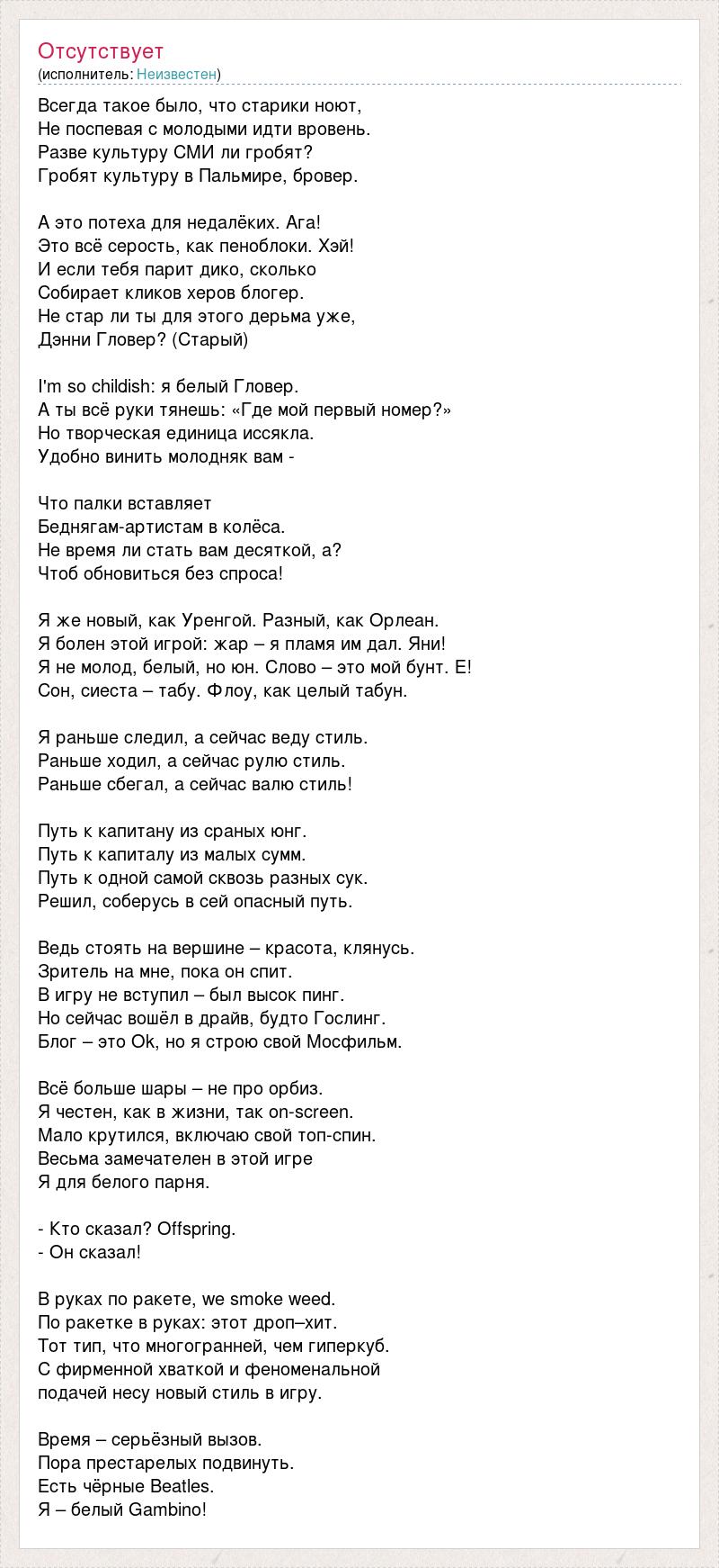 Всегда такое было, что старики ноют, Не поспевая с молодыми идти вровень. Разве культуру СМИ ли гробят? Гробят культуру в Пальмире, бровер. А это потеха для недалёких. Ага! Это всё серость, как пеноблоки. Хэй! И если тебя парит дико, сколько Собирает кликов херов блогер. Не стар ли ты для этого дерьма уже, Дэнни Гловер? (Старый) I'm so childish: я белый Гловер. А ты всё руки тянешь: «Где мой первый номер?» Но творческая единица иссякла. Удобно винить молодняк вам - Что палки вставляет Беднягам-артистам в колёса. Не время ли стать вам десяткой, а? Чтоб обновиться без спроса! Я же новый, как Уренгой. Разный, как Орлеан. Я болен этой игрой: жар – я пламя им дал. Яни! Я не молод, белый, но юн. Слово – это мой бунт. Е! Сон, сиеста – табу. Флоу, как целый табун. Я раньше следил, а сейчас веду стиль. Раньше ходил, а сейчас рулю стиль. Раньше сбегал, а сейчас валю стиль! Путь к капитану из сраных юнг. Путь к капиталу из малых сумм. Путь к одной самой сквозь разных сук. Решил, соберусь в сей опасный путь. Ведь стоять на вершине – красота, клянусь. Зритель на мне, пока он спит. В игру не вступил – был высок пинг. Но сейчас вошёл в драйв, будто Гослинг. Блог – это Ok, но я строю свой Мосфильм. Всё больше шары – не про орбиз. Я честен, как в жизни, так on-screen. Мало крутился, включаю свой топ-спин. Весьма замечателен в этой игре Я для белого парня. - Кто сказал? Offspring. - Он сказал! В руках по ракете, we smoke weed. По ракетке в руках: этот дроп–хит. Тот тип, что многогранней, чем гиперкуб. С фирменной хваткой и феноменальной подачей несу новый стиль в игру. Время – серьёзный вызов. Пора престарелых подвинуть. Есть чёрные Beatles. Я – белый Gambino!