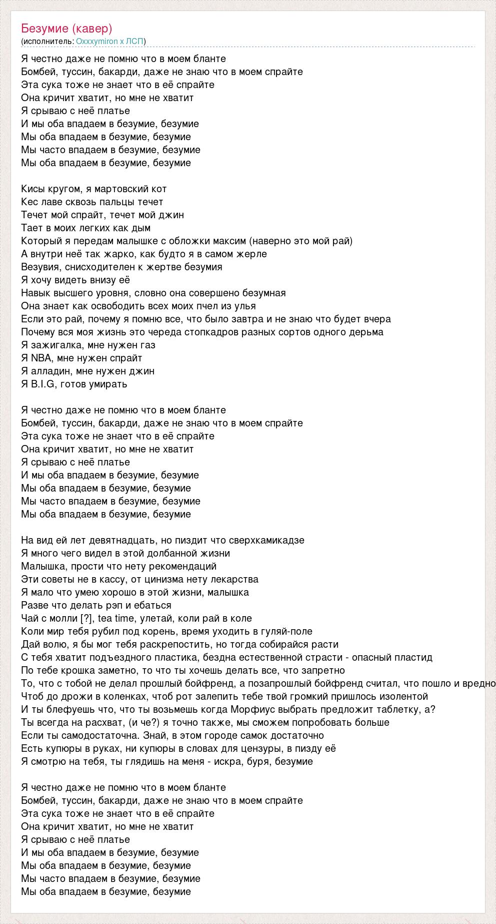 Я честно даже не помню что в моем бланте Бомбей, туссин, бакарди, даже не знаю что в моем спрайте Эта сука тоже не знает что в её спрайте Она кричит хватит, но мне не хватит Я срываю с неё платье И мы оба впадаем в безумие, безумие Мы оба впадаем в безумие, безумие Мы часто впадаем в безумие, безумие Мы оба впадаем в безумие, безумие Кисы кругом, я мартовский кот Кес лаве сквозь пальцы течет Течет мой спрайт, течет мой джин Тает в моих легких как дым Который я передам малышке с обложки максим (наверно это мой рай) А внутри неё так жарко, как будто я в самом жерле Везувия, снисходителен к жертве безумия Я хочу видеть внизу её Навык высшего уровня, словно она совершено безумная Она знает как освободить всех моих пчел из улья Если это рай, почему я помню все, что было завтра и не знаю что будет вчера Почему вся моя жизнь это череда стопкадров разных сортов одного дерьма Я зажигалка, мне нужен газ Я NBA, мне нужен спрайт Я алладин, мне нужен джин Я B.I.G, готов умирать Я честно даже не помню что в моем бланте Бомбей, туссин, бакарди, даже не знаю что в моем спрайте Эта сука тоже не знает что в её спрайте Она кричит хватит, но мне не хватит Я срываю с неё платье И мы оба впадаем в безумие, безумие Мы оба впадаем в безумие, безумие Мы часто впадаем в безумие, безумие Мы оба впадаем в безумие, безумие На вид ей лет девятнадцать, но пиздит что сверхкамикадзе Я много чего видел в этой долбанной жизни Малышка, прости что нету рекомендаций Эти советы не в кассу, от цинизма нету лекарства Я мало что умею хорошо в этой жизни, малышка Разве что делать рэп и ебаться Чай с молли [?], tea time, улетай, коли рай в коле Коли мир тебя рубил под корень, время уходить в гуляй-поле Дай волю, я бы мог тебя раскрепостить, но тогда собирайся расти С тебя хватит подъездного пластика, бездна естественной страсти - опасный пластид По тебе крошка заметно, то что ты хочешь делать все, что запретно То, что с тобой не делал прошлый бойфренд, а позапрошлый бойфренд считал, что пошло и вредно Чтоб до дрожи в коленках, чтоб рот залепить тебе твой громкий пришлось изолентой И ты блефуешь что, что ты возьмешь когда Морфиус выбрать предложит таблетку, а? Ты всегда на расхват, (и че?) я точно также, мы сможем попробовать больше Если ты самодостаточна. Знай, в этом городе самок достаточно Есть купюры в руках, ни купюры в словах для цензуры, в пизду её Я смотрю на тебя, ты глядишь на меня - искра, буря, безумие Я честно даже не помню что в моем бланте Бомбей, туссин, бакарди, даже не знаю что в моем спрайте Эта сука тоже не знает что в её спрайте Она кричит хватит, но мне не хватит Я срываю с неё платье И мы оба впадаем в безумие, безумие Мы оба впадаем в безумие, безумие Мы часто впадаем в безумие, безумие Мы оба впадаем в безумие, безумие