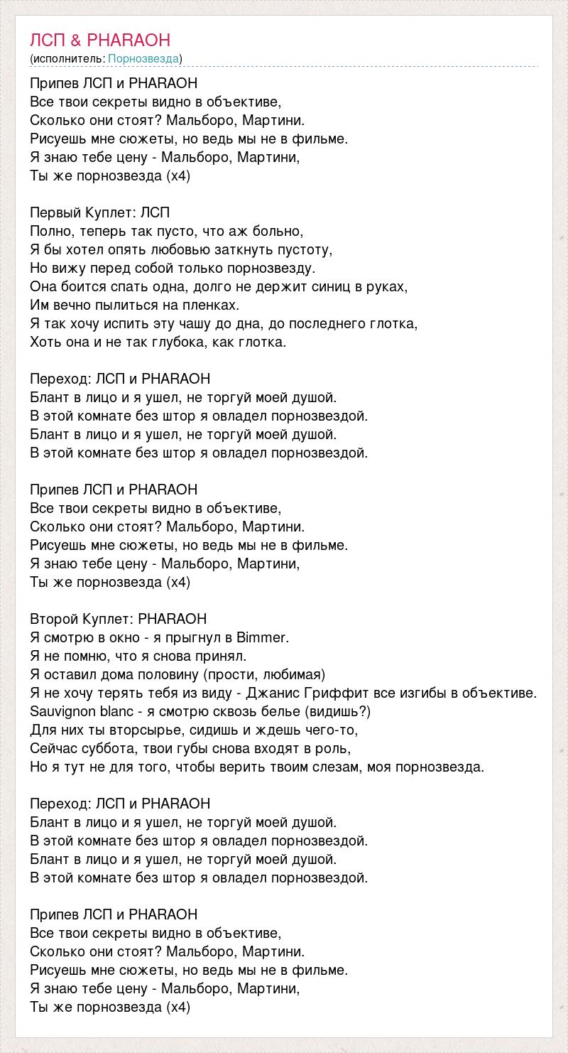 Припев ЛСП и PHARAOH Все твои секреты видно в объективе, Сколько они стоят? Мальборо, Мартини. Рисуешь мне сюжеты, но ведь мы не в фильме. Я знаю тебе цену - Мальборо, Мартини, Ты же порнозвезда (х4) Первый Куплет: ЛСП Полно, теперь так пусто, что аж больно, Я бы хотел опять любовью заткнуть пустоту, Но вижу перед собой только порнозвезду. Она боится спать одна, долго не держит синиц в руках, Им вечно пылиться на пленках. Я так хочу испить эту чашу до дна, до последнего глотка, Хоть она и не так глубока, как глотка. Переход: ЛСП и PHARAOH Блант в лицо и я ушел, не торгуй моей душой. В этой комнате без штор я овладел порнозвездой. Блант в лицо и я ушел, не торгуй моей душой. В этой комнате без штор я овладел порнозвездой. Припев ЛСП и PHARAOH Все твои секреты видно в объективе, Сколько они стоят? Мальборо, Мартини. Рисуешь мне сюжеты, но ведь мы не в фильме. Я знаю тебе цену - Мальборо, Мартини, Ты же порнозвезда (х4) Второй Куплет: PHARAOH Я смотрю в окно - я прыгнул в Bimmer. Я не помню, что я снова принял. Я оставил дома половину (прости, любимая) Я не хочу терять тебя из виду - Джанис Гриффит все изгибы в объективе. Sauvignon blanc - я смотрю сквозь белье (видишь?) Для них ты вторсырье, сидишь и ждешь чего-то, Сейчас суббота, твои губы снова входят в роль, Но я тут не для того, чтобы верить твоим слезам, моя порнозвезда. Переход: ЛСП и PHARAOH Блант в лицо и я ушел, не торгуй моей душой. В этой комнате без штор я овладел порнозвездой. Блант в лицо и я ушел, не торгуй моей душой. В этой комнате без штор я овладел порнозвездой. Припев ЛСП и PHARAOH Все твои секреты видно в объективе, Сколько они стоят? Мальборо, Мартини. Рисуешь мне сюжеты, но ведь мы не в фильме. Я знаю тебе цену - Мальборо, Мартини, Ты же порнозвезда (х4)