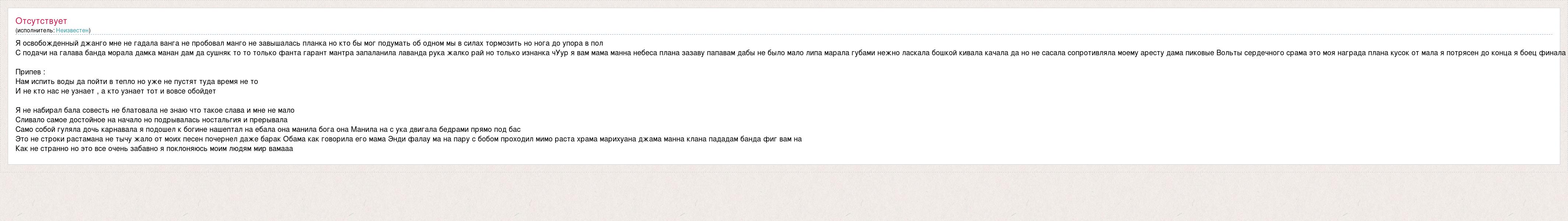 Я освобожденный джанго мне не гадала ванга не пробовал манго не завышалась планка но кто бы мог подумать об одном мы в силах тормозить но нога до упора в пол С подачи на галава банда морала дамка манан дам да сушняк то то только фанта гарант мантра запаланила лаванда рука жалко рай но только изнанка чУур я вам мама манна небеса плана зазаву папавам дабы не было мало липа марала губами нежно ласкала бошкой кивала качала да но не сасала сопротивляла моему аресту дама пиковые Вольты сердечного срама это моя награда плана кусок от мала я потрясен до конца я боец финала Припев : Нам испить воды да пойти в тепло но уже не пустят туда время не то И не кто нас не узнает , а кто узнает тот и вовсе обойдет Я не набирал бала совесть не блатовала не знаю что такое слава и мне не мало Сливало самое достойное на начало но подрывалась ностальгия и прерывала Само собой гуляла дочь карнавала я подошел к богине нашептал на ебала она манила бога она Манила на с ука двигала бедрами прямо под бас Это не строки растамана не тычу жало от моих песен почернел даже барак Обама как говорила его мама Энди фалау ма на пару с бобом проходил мимо раста храма марихуана джама манна клана пададам банда фиг вам на Как не странно но это все очень забавно я поклоняюсь моим людям мир вамааа