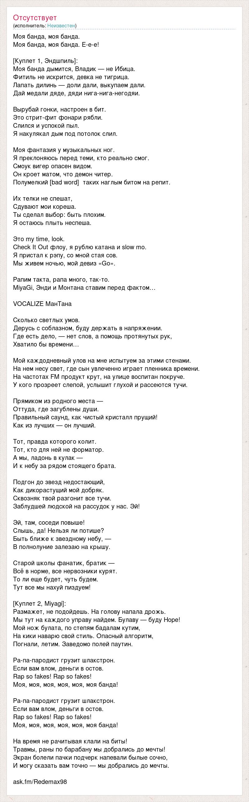 Моя банда, моя банда. Моя банда, моя банда. Е-е-е! [Куплет 1, Эндшпиль]: Моя банда дымится, Владик — не Ибица. Фитиль не искрится, девка не тигрица. Лапать дилинь — доли дали, выкупаем дали. Дай медали дяде, дяди нига-нига-негодяи. Вырубай гонки, настроен в бит. Это стрит-фит фонари рябли. Слился и успокой пыл. Я накулякал дым под потолок слил. Моя фантазия у музыкальных ног. Я преклоняюсь перед теми, кто реально смог. Смоук вигер опасен видом. Он кроет матом, что демон читер. Полумелкий [bad word] таких наглым битом на репит. Их телки не спешат, Сдувают мои кореша. Ты сделал выбор: быть плохим. Я остаюсь плыть неспеша. Это my time, look. Check It Out флоу, я рублю катана и slow mo. Я пристал к рэпу, со мной стая сов. Мы живем ночью, мой девиз «Go». Рапим такта, рапа много, так-то. MiyaGi, Энди и Монтана ставим перед фактом… VOCALIZE МанТана Сколько светлых умов. Дерусь с соблазном, буду держать в напряжении. Где есть дело, — нет слов, а помощь протянутых рук, Хватило бы времени… Мой каждодневный улов на мне испытуем за этими стенами. На нем несу свет, где сын увлеченно играет пленника времени. На частотах FM продукт крут, на улице воспитан покруче. У кого прозреет слепой, услышит глухой и рассеются тучи. Прямиком из родного места — Оттуда, где загублены души. Правильный саунд, как чистый кристалл прущий! Как из лучших — он лучший. Тот, правда которого колит. Тот, кто для ней не форматор. А мы, ладонь в кулак — И к небу за рядом стоящего брата. Подгон до звезд недостающий, Как дикорастущий мой добряк. Сквозняк твой разгонит все тучи. Заблудшей людской на рассудок у нас. Эй! Эй, там, соседи повыше! Слышь, да! Нельзя ли потише? Быть ближе к звездному небу, — В полнолуние залезаю на крышу. Старой школы фанатик, братик — Всё в норме, все нервозники курят. То ли еще будет, чуть будем. Тут все мы нахуй пиздуем! [Куплет 2, Miyagi]: Размажет, не подойдешь. На голову напала дрожь. Мы тут на каждого управу найдем. Булаву — буду Hope! Мой нож булата, по степям бадалам кутим, На кики наварю свой стиль. Опасный алгоритм, Погнали, летим. Заведомо полей паутин. Ра-па-пародист грузит шлакстрон. Если вам влом, деньги в остов. Rap so fakes! Rap so fakes! Моя, моя, моя, моя, моя, моя банда! Ра-па-пародист грузит шлакстрон. Если вам влом, деньги в остов. Rap so fakes! Rap so fakes! Моя, моя, моя, моя, моя, моя банда! На время не рачитывая клали на биты! Травмы, раны по барабану мы добрались до мечты! Экран болели пачки подчерк напевали былые сочно, И могу сказать вам точно — мы добрались до мечты. ask.fm/Redemax98