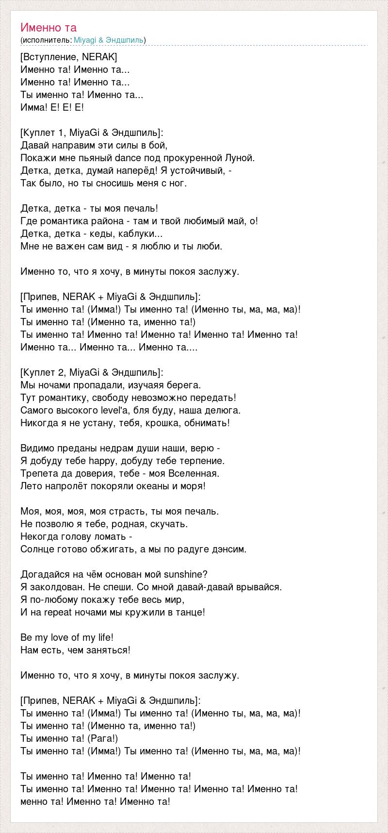 [Вступление, NERAK] Именно та! Именно та... Именно та! Именно та... Ты именно та! Именно та... Имма! Е! Е! Е! [Куплет 1, MiyaGi & Эндшпиль]: Давай направим эти силы в бой, Покажи мне пьяный dаnce под прокуренной Луной. Детка, детка, думай наперёд! Я устойчивый, - Так было, но ты сносишь меня с ног. Детка, детка - ты моя печаль! Где романтика района - там и твой любимый май, о! Детка, детка - кеды, каблуки... Мне не важен сам вид - я люблю и ты люби. Именно то, что я хочу, в минуты покоя заслужу. [Припев, NERAK + MiyaGi & Эндшпиль]: Ты именно та! (Имма!) Ты именно та! (Именно ты, ма, ма, ма)! Ты именно та! (Именно та, именно та!) Ты именно та! Именно та! Именно та! Именно та! Именно та! Именно та... Именно та... Именно та.... [Куплет 2, MiyaGi & Эндшпиль]: Мы ночами пропадали, изучаяя берега. Тут романтику, свободу невозможно передать! Самого высокого level'а, бля буду, наша делюга. Никогда я не устану, тебя, крошка, обнимать! Видимо преданы недрам души наши, верю - Я добуду тебе happy, добуду тебе терпение. Трепета да доверия, тебе - моя Вселенная. Лето напролёт покоряли океаны и моря! Моя, моя, моя, моя страсть, ты моя печаль. Не позволю я тебе, родная, скучать. Некогда голову ломать - Солнце готово обжигать, а мы по радуге дэнсим. Догадайся на чём основан мой sunshine? Я заколдован. Не спеши. Со мной давай-давай врывайся. Я по-любому покажу тебе весь мир, И на repeat ночами мы кружили в танце! Be my love of my life! Нам есть, чем заняться! Именно то, что я хочу, в минуты покоя заслужу. [Припев, NERAK + MiyaGi & Эндшпиль]: Ты именно та! (Имма!) Ты именно та! (Именно ты, ма, ма, ма)! Ты именно та! (Именно та, именно та!) Ты именно та! (Рага!) Ты именно та! (Имма!) Ты именно та! (Именно ты, ма, ма, ма)! Ты именно та! Именно та! Именно та! Ты именно та! Именно та! Именно та! Именно та! Именно та! менно та! Именно та! Именно та!