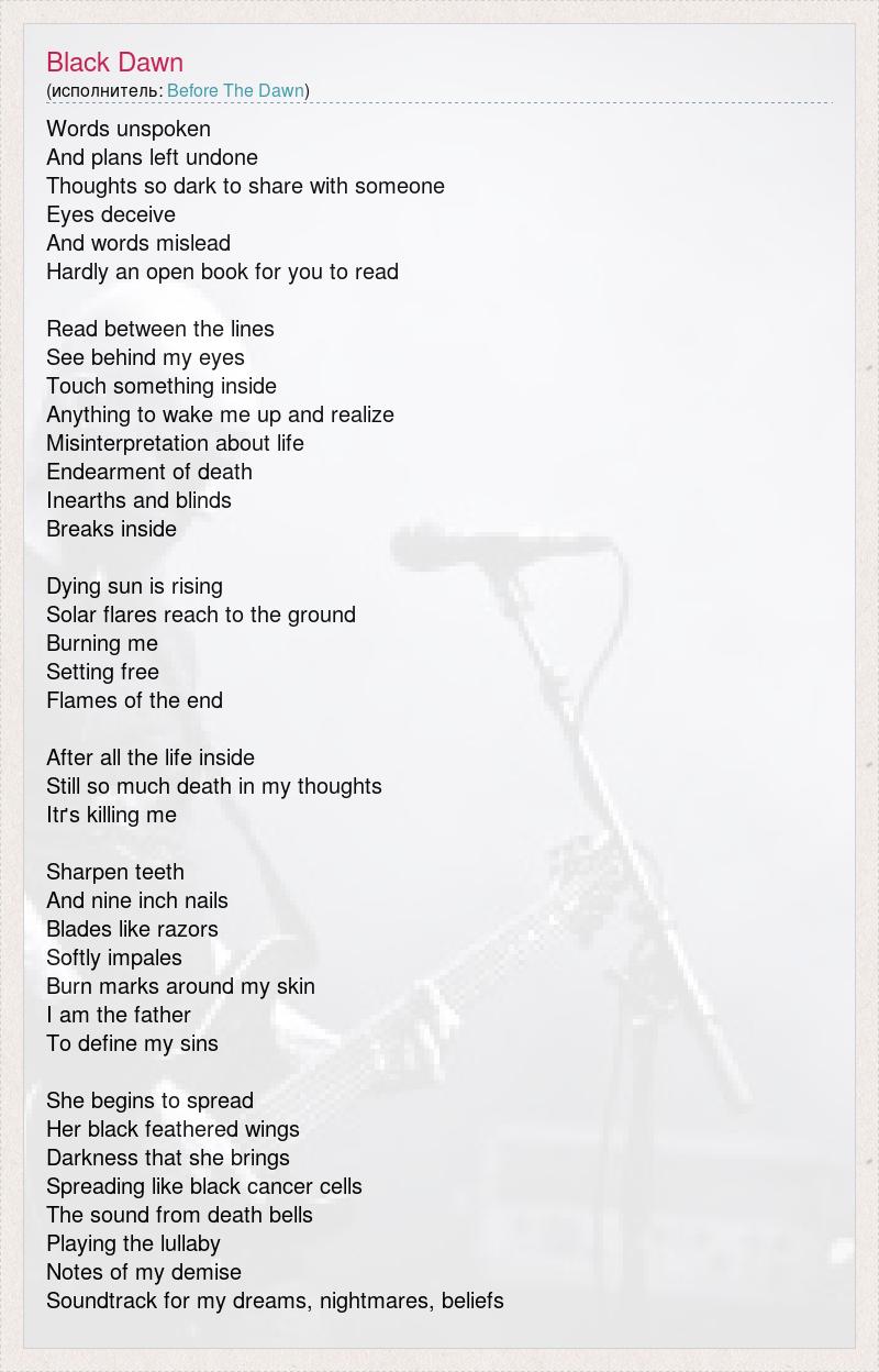 Words unspoken And plans left undone Thoughts so dark to share with someone Eyes deceive And words mislead Hardly an open book for you to read Read between the lines See behind my eyes Touch something inside Anything to wake me up and realize Misinterpretation about life Endearment of death Inearths and blinds Breaks inside Dying sun is rising Solar flares reach to the ground Burning me Setting free Flames of the end After all the life inside Still so much death in my thoughts Itґs killing me Sharpen teeth And nine inch nails Blades like razors Softly impales Burn marks around my skin I am the father To define my sins She begins to spread Her black feathered wings Darkness that she brings Spreading like black cancer cells The sound from death bells Playing the lullaby Notes of my demise Soundtrack for my dreams, nightmares, beliefs